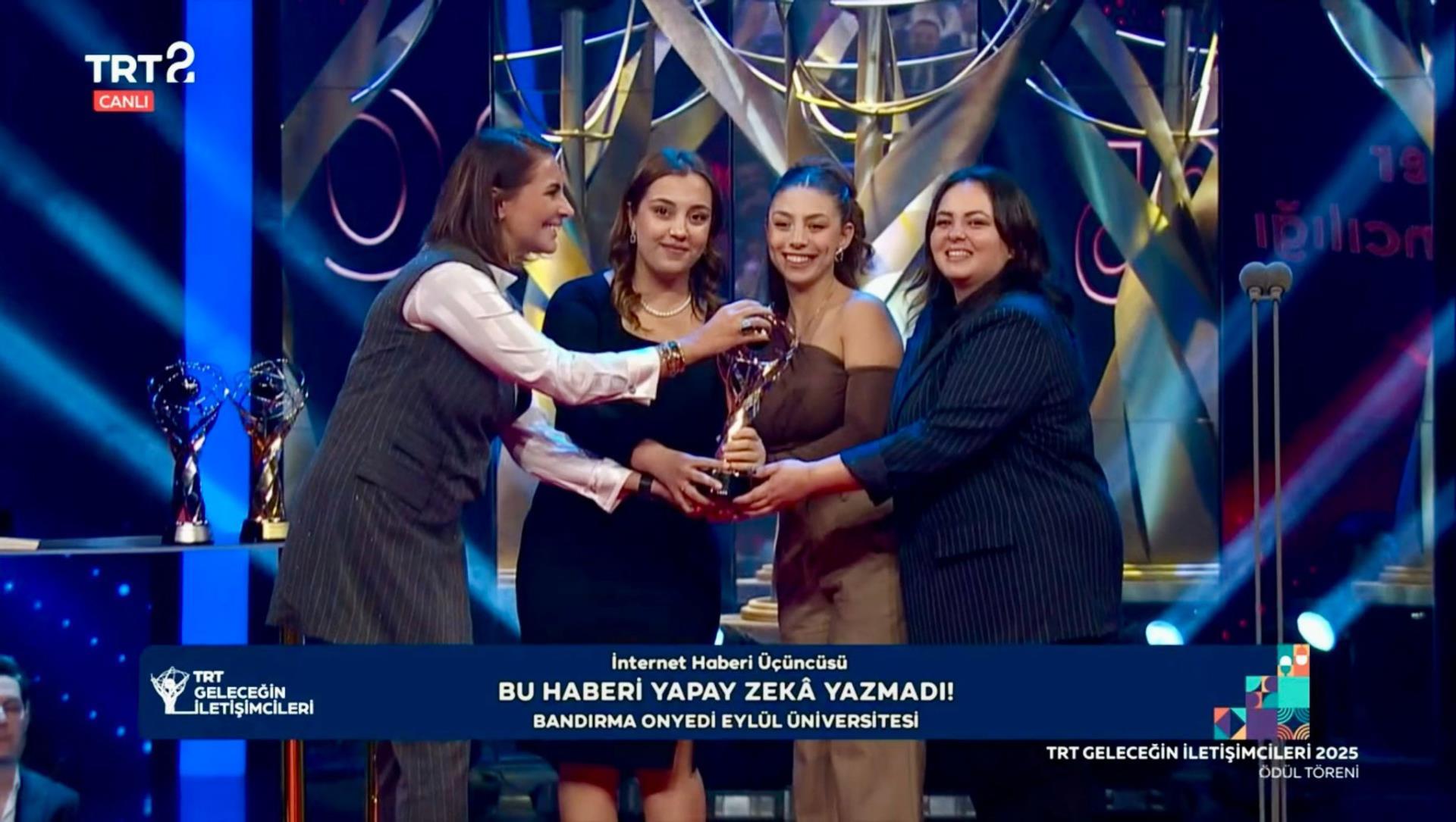 In the News Broadcasting (Online News) category, the project titled “This News Was Not Written by Artificial Intelligence!”, prepared by Sude Topuz, Elif Kın, and Beyza Yurttutan from the Department of New Media and Communication under the supervision of PhD student Zafer Yılmaz, received the Bronze Award (Third Place).