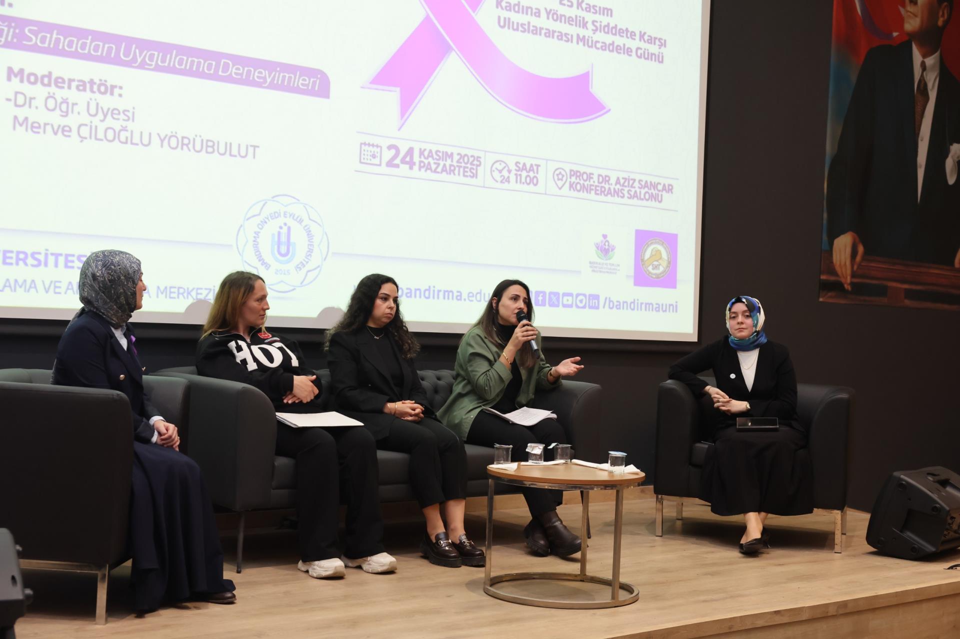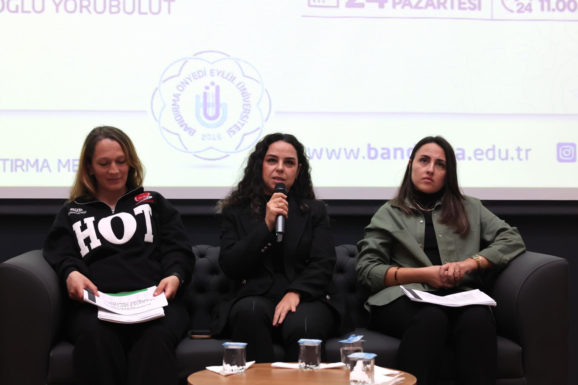 The panel opened with welcoming remarks delivered by BANÜ-KAT Director Assoc. Prof. Dr. Zeynep Aca. The first session, titled “Background of Violence: Sociological and Psychological Perspectives,” featured Sociologist Dr. Eda Kılıç and Clinical Psychologist Serra Ayaz as speakers, with Dr. Sinem Atay of the Faculty of Economics and Administrative Sciences serving as moderator. While Dr. Eda Kılıç addressed the sociological dimensions of violence, Clinical Psychologist Serra Ayaz examined its psychological impacts in a comprehensive manner. At the end of the session, certificates of appreciation were presented to the speakers by Sibel Boz, Prof. Dr. Serap Palaz Çakır, and Prof. Dr. Aybeniz Akdeniz Ar.