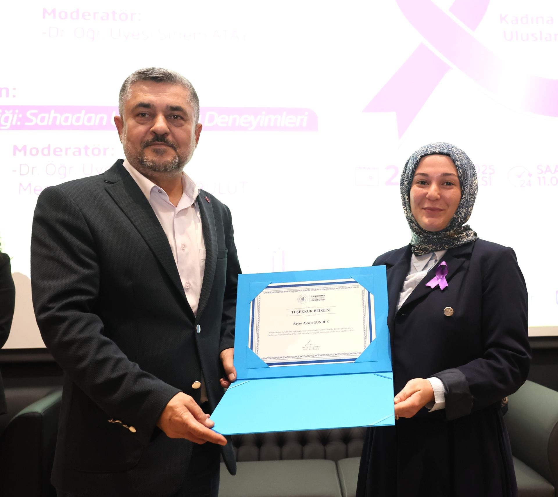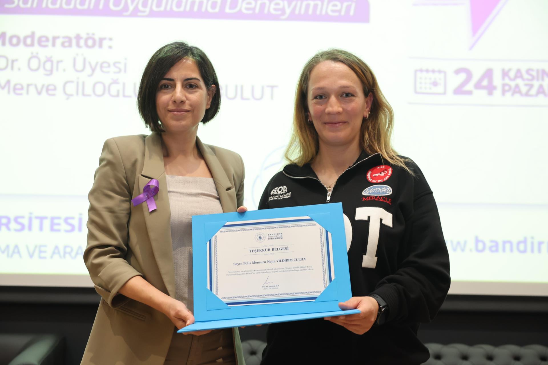 The second session, titled “Protection, Intervention, and Cooperation: Practice-Based Field Experiences,” hosted Social Worker Ayşen Gündüz; Chief Inspector Hilal Sert from the Bandırma District Police Department; and police officers Nejla Yıldırım Çulha and Elif Sili, who shared their field experiences related to intervention practices. The session was moderated by Dr. Merve Çiloğlu Yörübülut from the Faculty of Economics and Administrative Sciences. The interactive session advanced with contributions from the audience, and concluded with the presentation of certificates of appreciation to the participants by Prof. Dr. Recep Yıldız, Assoc. Prof. Dr. Zeynep Aca, and Dr. Gizem Burcu Karaali.