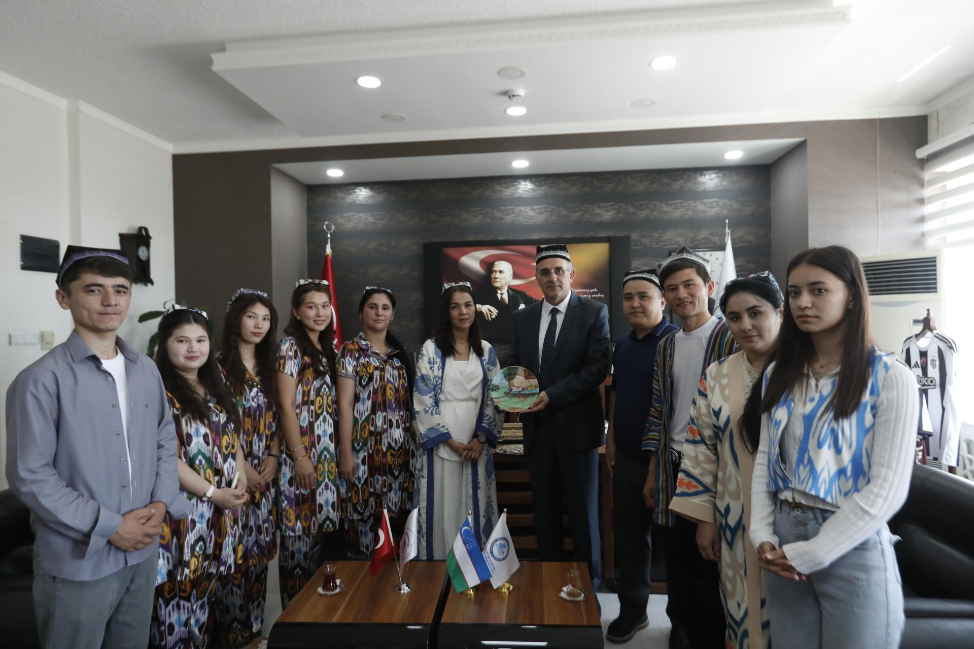 Üniversitemiz ile Özbekistan Taşkent İktisat ve Pedagoji Üniversitesi arasında imzalanan iş birliği protokolü kapsamında Üniversitemize gelen akademisyen ve öğrencilerden oluşan heyet, Rektörümüz Prof. Dr. İsmail Boz’u makamında ziyaret etti.