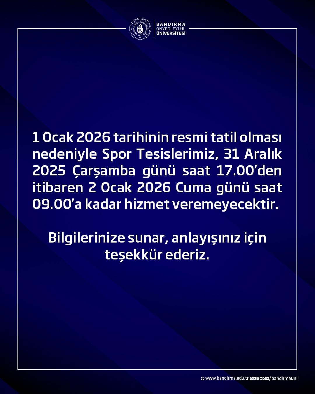 1 Ocak 2026 tarihinin resmi tatil olması nedeniyle Spor Tesislerimiz, 31 Aralık 2025 Çarşamba günü saat 17.00’den itibaren 2 Ocak 2026 Cuma günü saat 09.00’a kadar hizmet veremeyecektir.