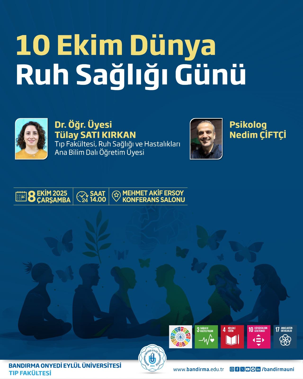 Etkinlikte, Tıp Fakültemiz Ruh Sağlığı ve Hastalıkları Anabilim Dalı Dr. Öğr. Üyesi Tülay Satı Kırkan ve Psikolog Nedim Çiftçi konuşmacı olarak yer alacaktır.