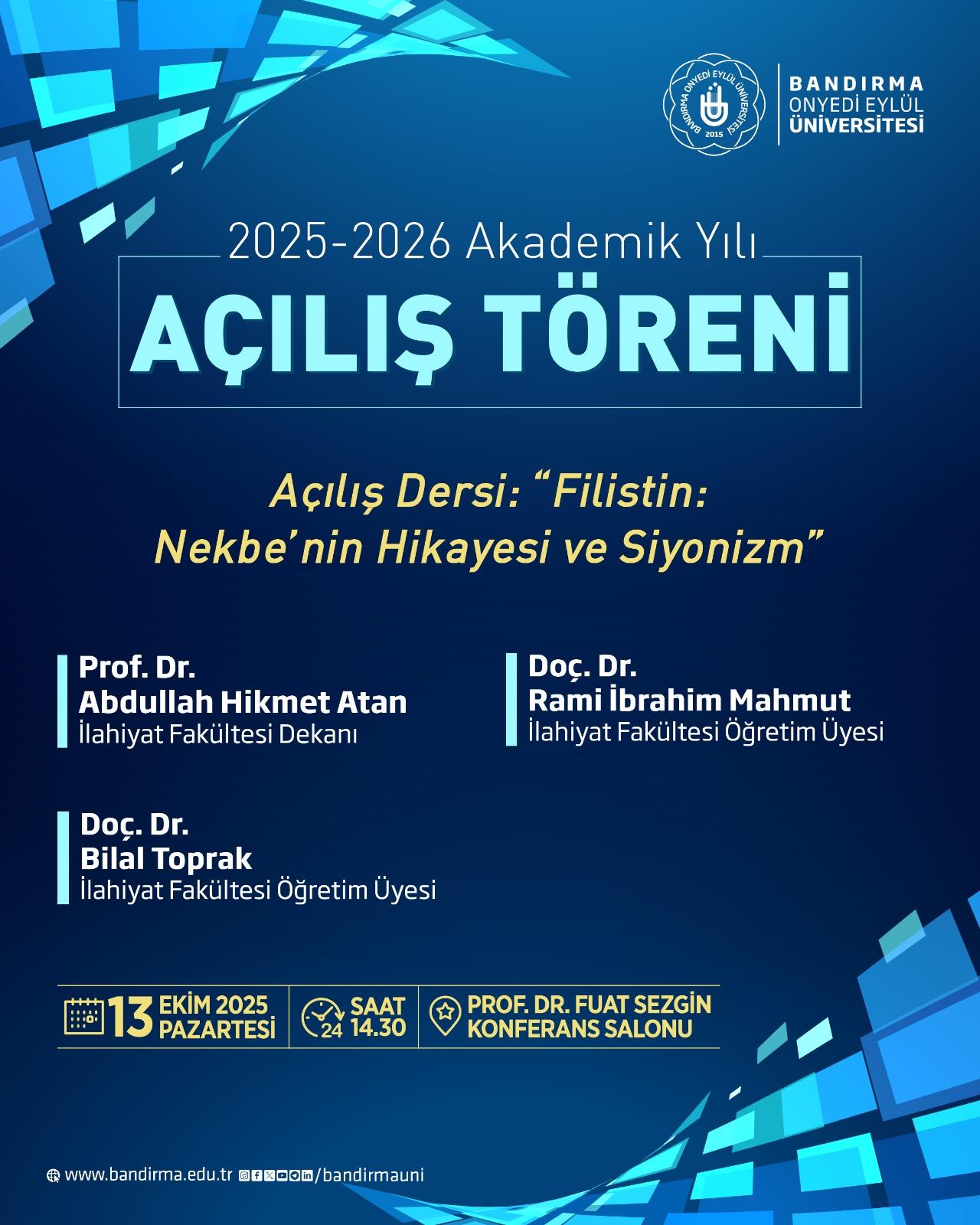 Üniversitemizde, 2025–2026 Akademik Yılı açılışı dolayısıyla bir tören düzenlenecektir. Tören kapsamında açılış dersi, “Filistin: Nekbe’nin Hikayesi ve Siyonizm” başlığıyla gerçekleştirilecektir. Açılış dersine, İlahiyat Fakültesi Öğretim Üyeleri Doç. Dr. Rami İbrahim Mahmut ve Doç. Dr. Bilal Toprak konuşmacı olarak katılacaklardır. Programın moderatörlüğünü ise İlahiyat Fakültesi Dekanımız Prof. Dr. Abdullah Hikmet Atan üstlenecektir.