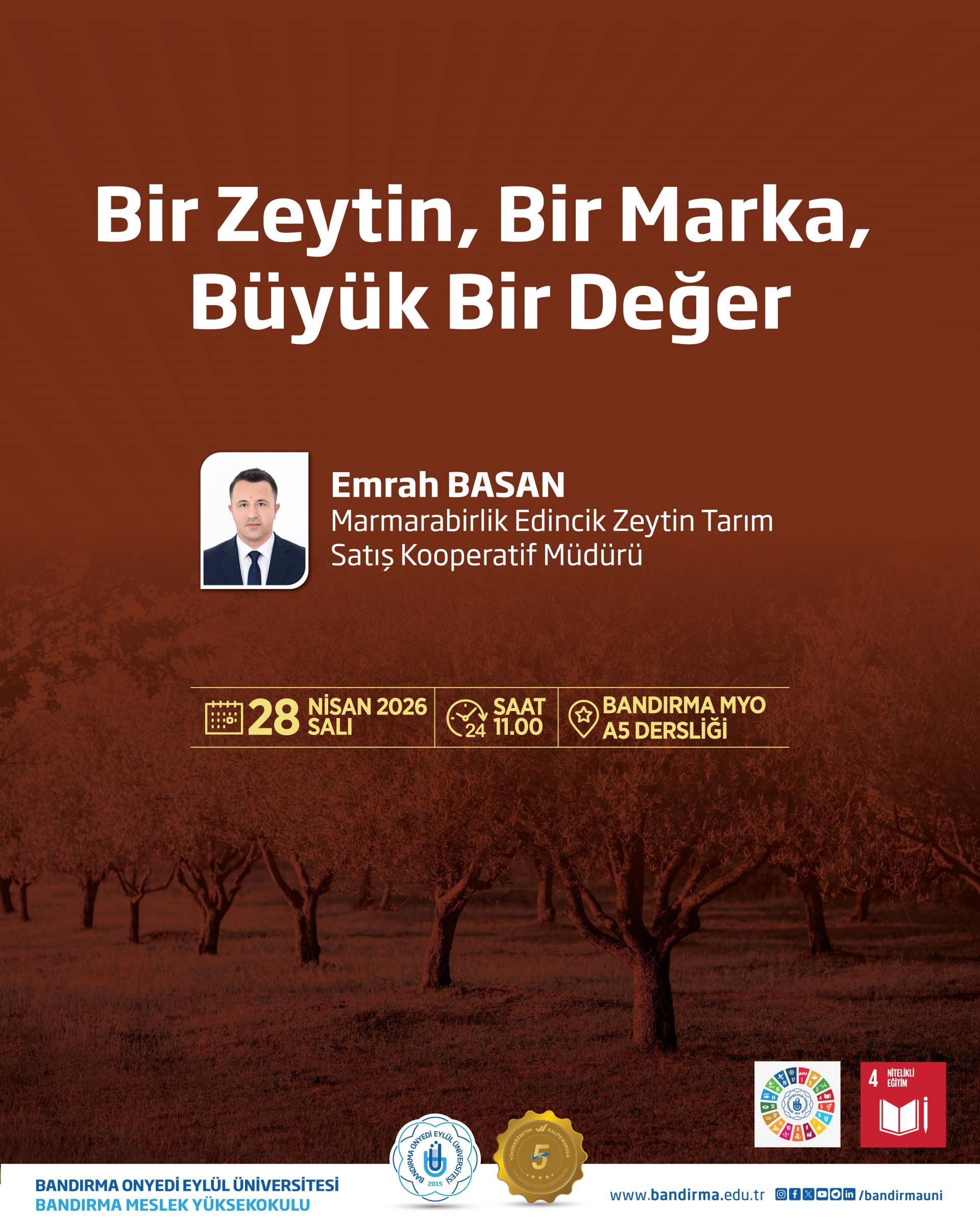 Bandırma Meslek Yüksekokulumuz tarafından “Bir Zeytin, Bir Marka, Büyük Bir Değer” konulu konferans düzenlenecektir.