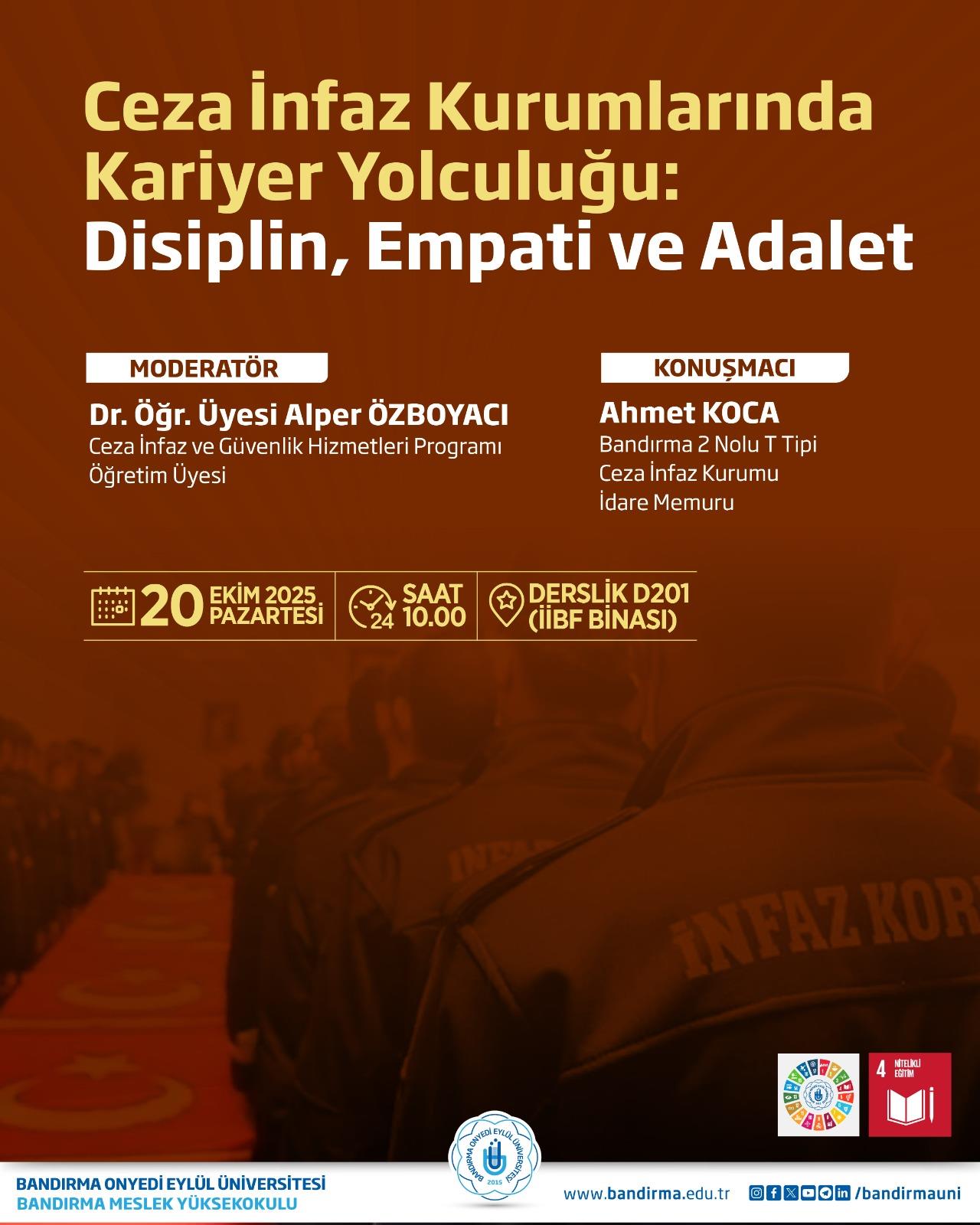 Bandırma Meslek Yüksekokulumuz tarafından, ceza infaz kurumlarında kariyer yapmayı hedefleyen öğrencilere yönelik farkındalık oluşturmak amacıyla “Ceza İnfaz Kurumlarında Kariyer Yolculuğu: Disiplin, Empati ve Adalet” başlıklı bir konferans gerçekleştirilecektir.