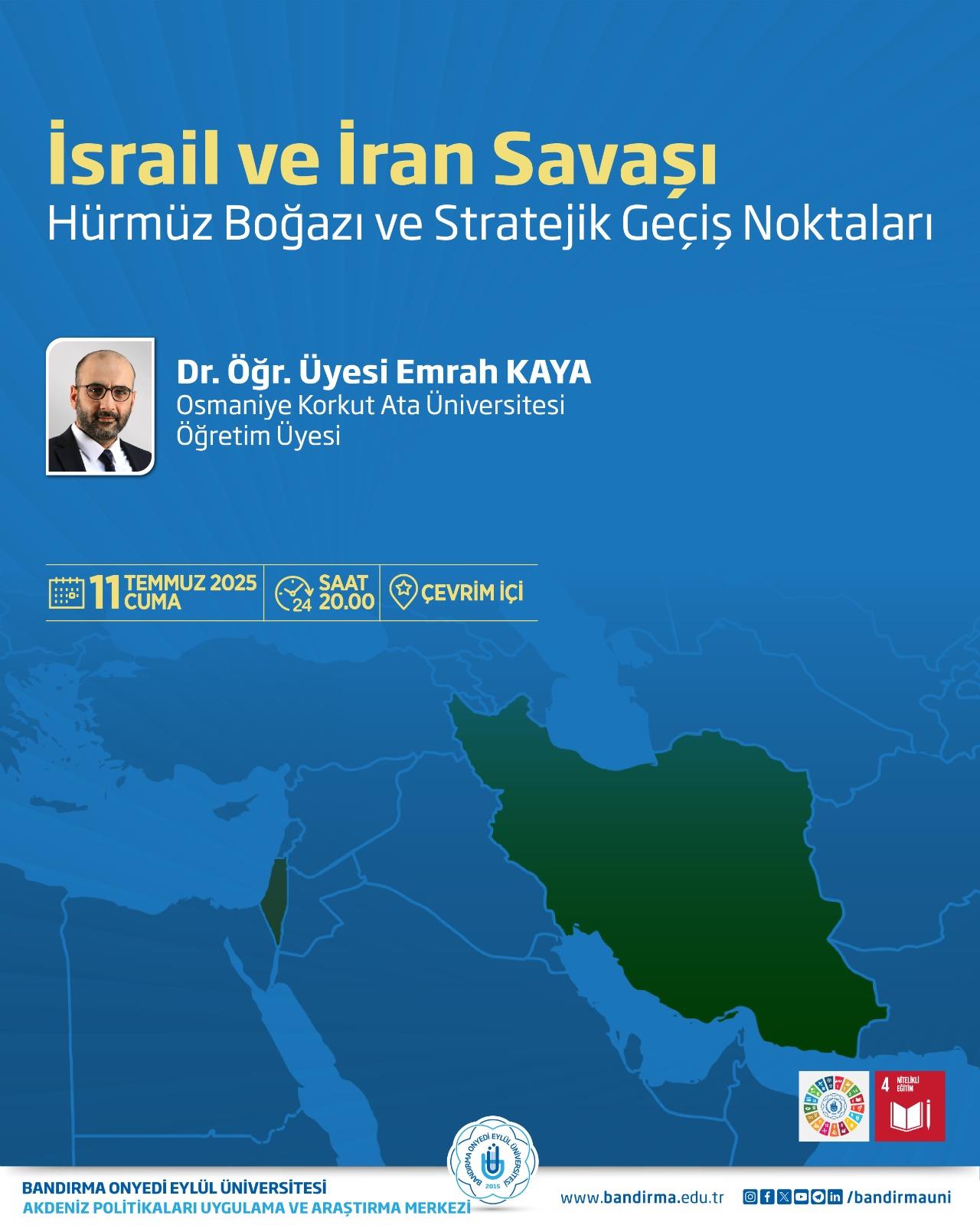 Üniversitemiz Akdeniz Politikaları Uygulama ve Araştırma Merkezi tarafından “İsrail ve İran Savaşı: Hürmüz Boğazı ve Stratejik Geçiş Noktaları” başlıklı konferans düzenlenecektir.