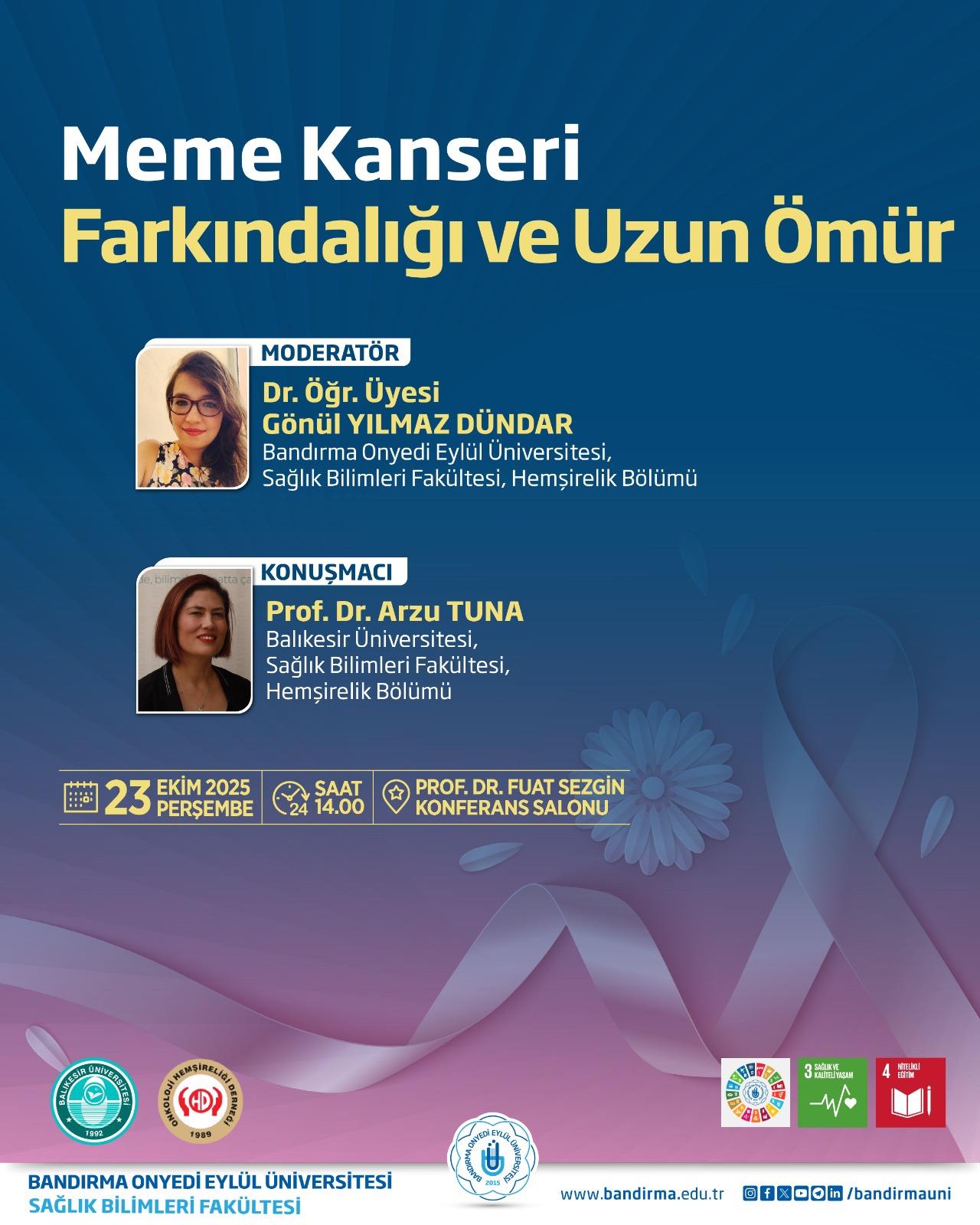 Sağlık Bilimleri Fakültemiz tarafından, meme kanseri hakkında farkındalık oluşturmak ve erken tanının önemine dikkat çekmek amacıyla “Meme Kanseri Farkındalığı ve Uzun Ömür” başlıklı bir konferans gerçekleştirilecektir.
