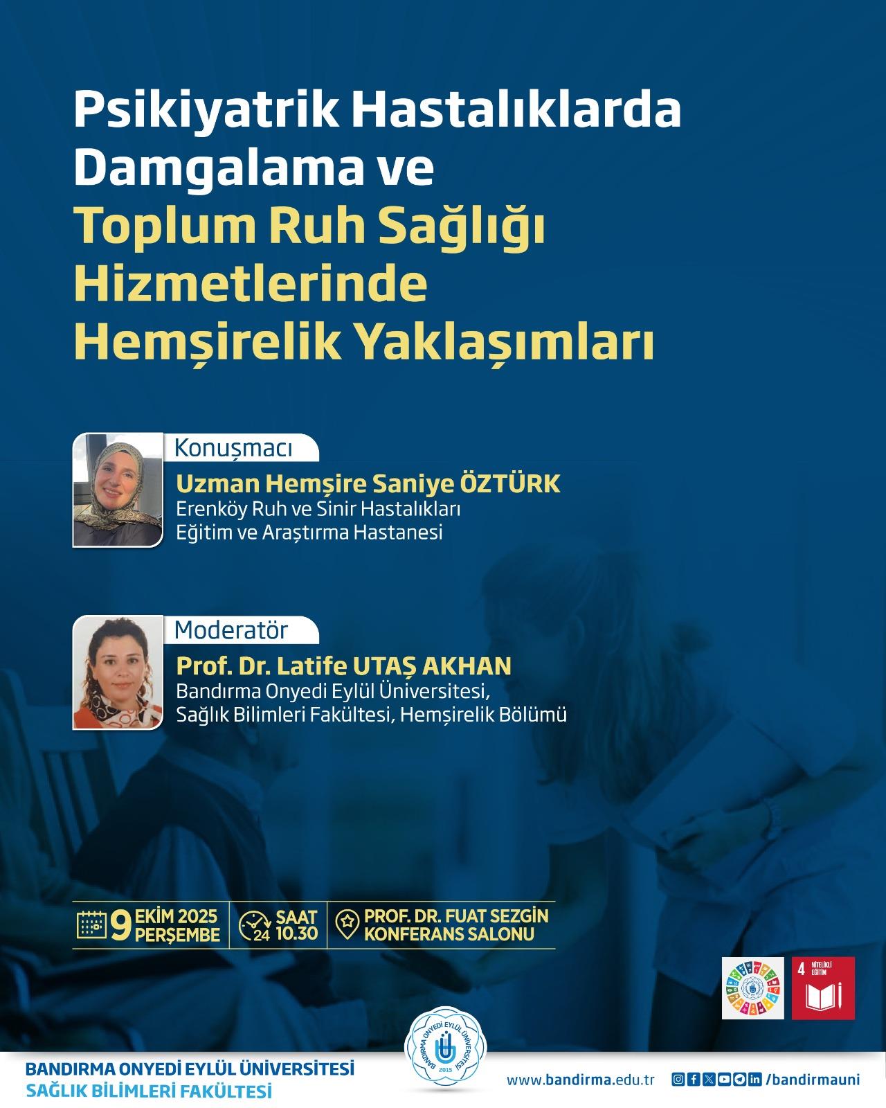 Sağlık Bilimleri Fakültemiz tarafından, ruh sağlığı alanında hizmet veren profesyonellere yönelik farkındalık oluşturmak amacıyla “Psikiyatrik Hastalıklarda Damgalama ve Toplum Ruh Sağlığı Hizmetlerinde Hemşirelik Yaklaşımları” başlıklı bir etkinlik gerçekleştirilecektir.