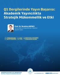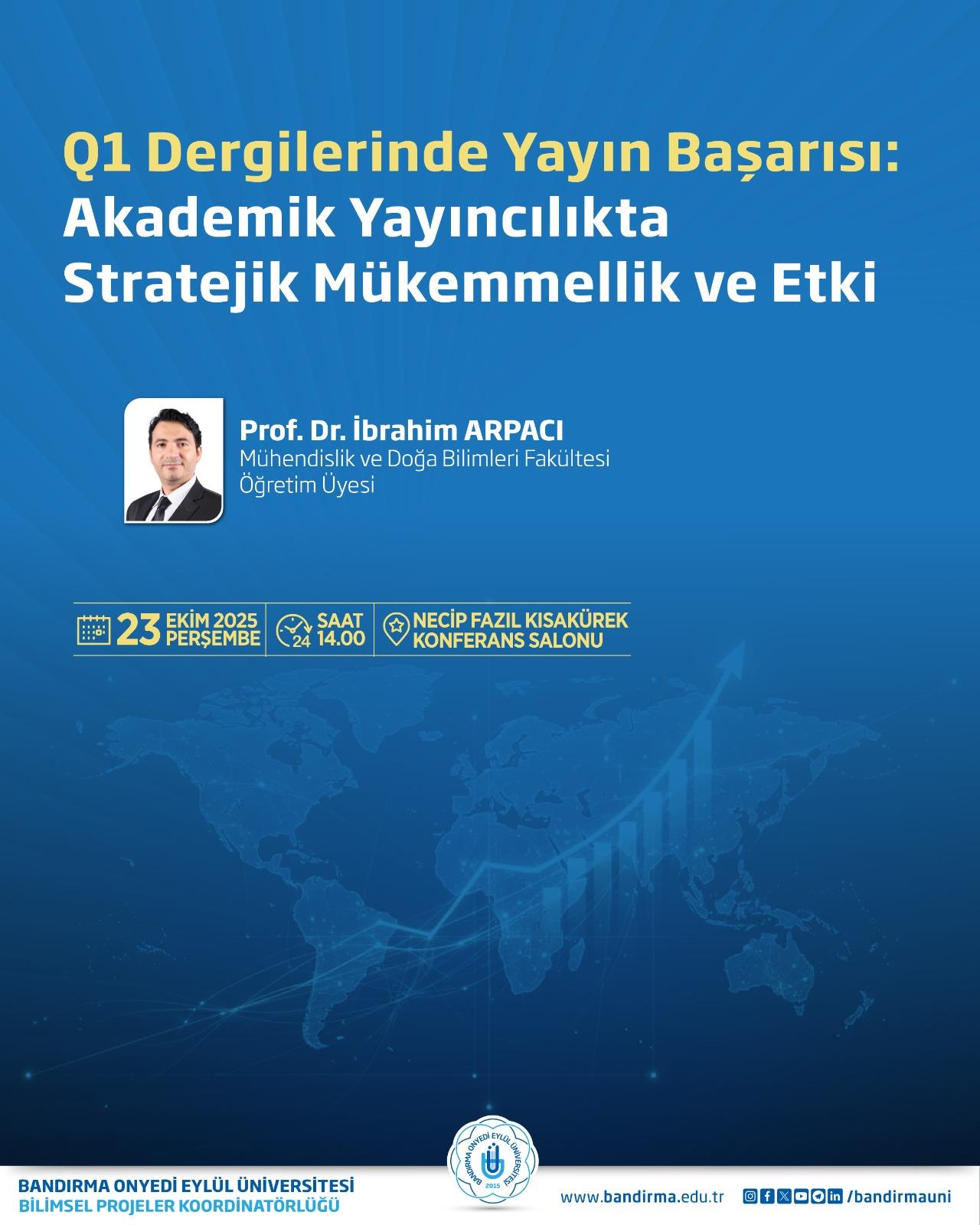 Bilimsel Projeler Koordinatörlüğümüz tarafından, akademik yayıncılıkta kalite ve etkiyi artırmak amacıyla “Q1 Dergilerinde Yayın Başarısı: Akademik Yayıncılıkta Stratejik Mükemmelik ve Etki” başlıklı bir konferans gerçekleştirilecektir.