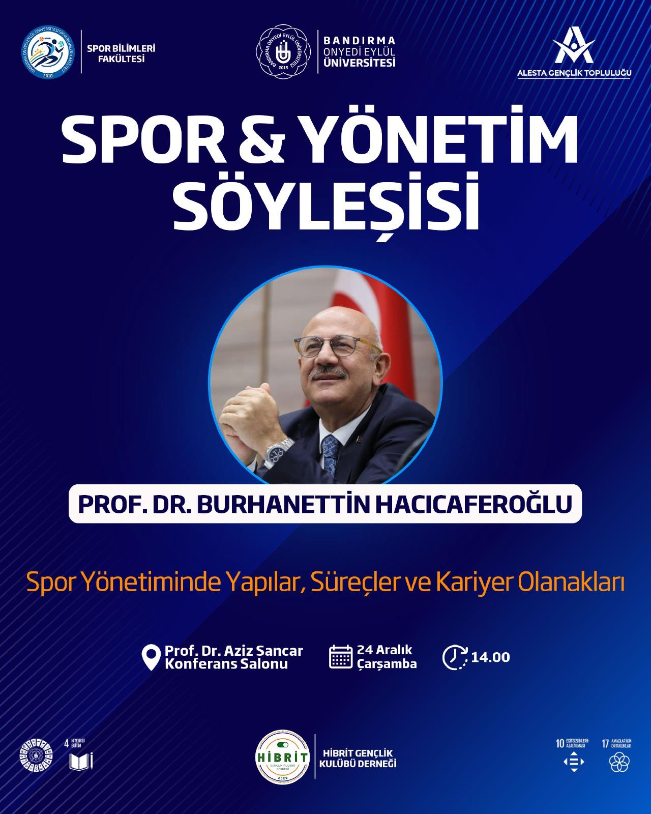 Söyleşiye, Akdeniz Üniversitesi Spor Bilimleri Fakültesi Öğretim Üyesi Prof. Dr. Burhanettin Hacıcaferoğlu konuşmacı olarak katılım sağlayacaktır. Etkinlikte, spor yönetiminde yapılar, süreçler ve kariyer olanakları ele alınacaktır. Etkinlik, 24 Aralık 2025 Çarşamba günü saat 14.00’te Prof. Dr. Aziz Sancar Konferans Salonu’nda gerçekleştirilecektir.