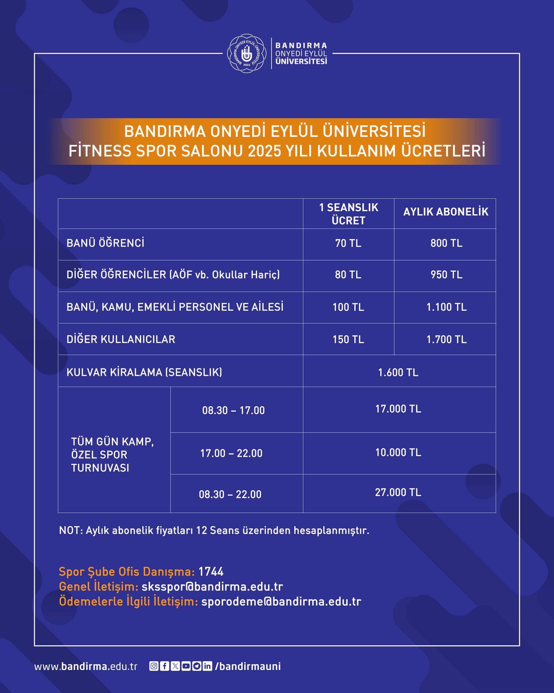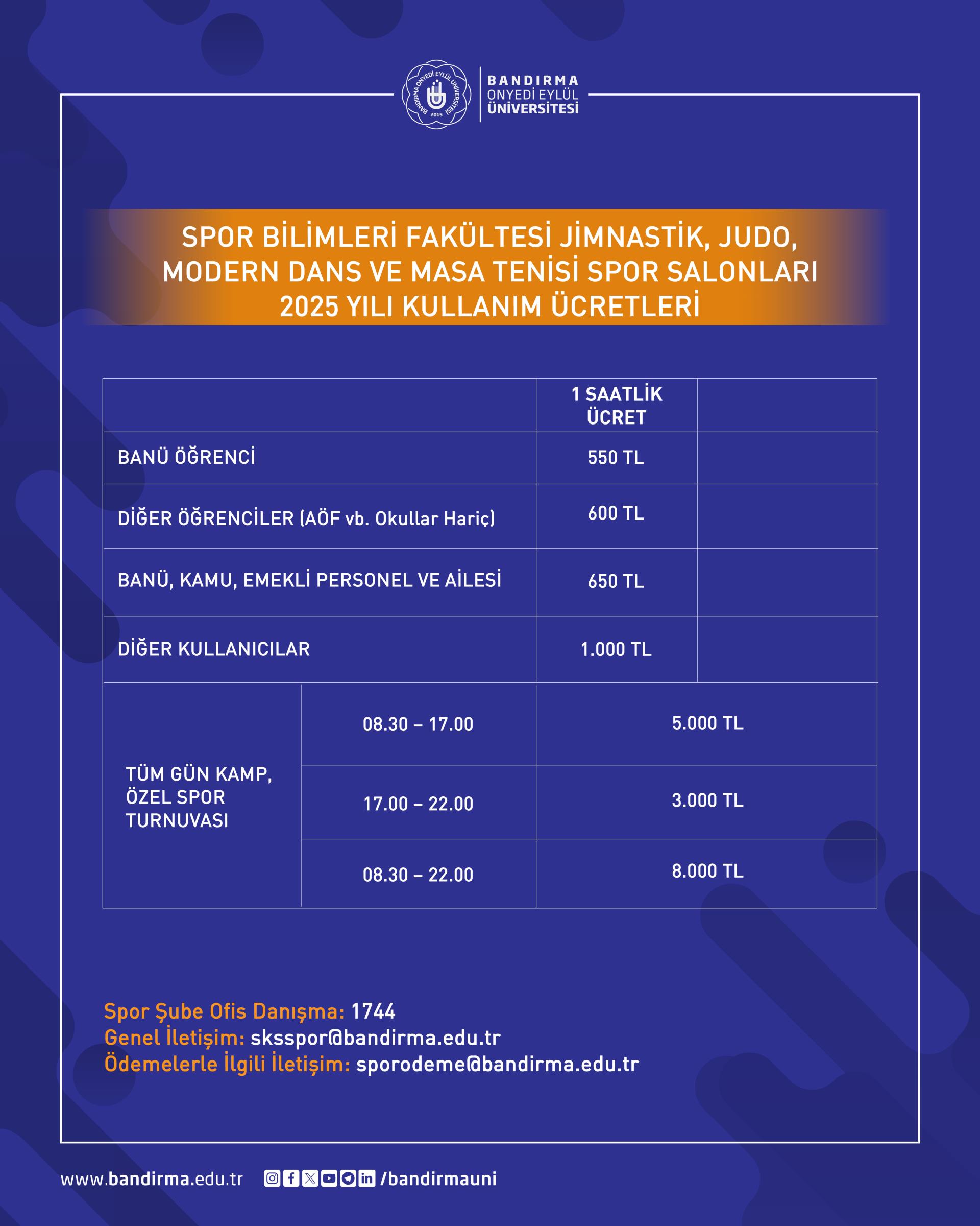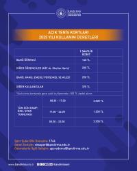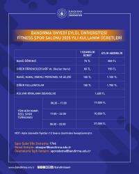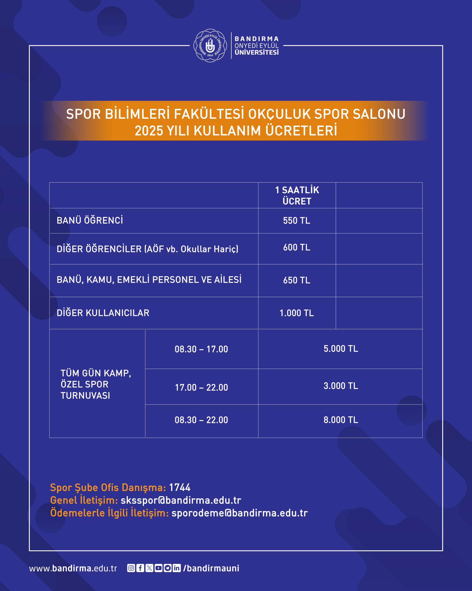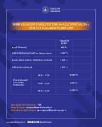 Tesislerden yararlanmak isteyen tüm kullanıcılarımız için hazırlanan ücretlendirme tablosu aşağıda yer almaktadır. Belirtilen ücretlerin, ilgili banka hesabına yatırılması gerekmektedir. Güçlü bir beden, sağlıklı bir zihin ve daha dinamik bir yaşam için sizleri spor tesislerimize davet ediyor, spor tesislerimizin Tüm Üniversite mensuplarımıza ve halkımıza hayırlı olmasını diliyoruz.