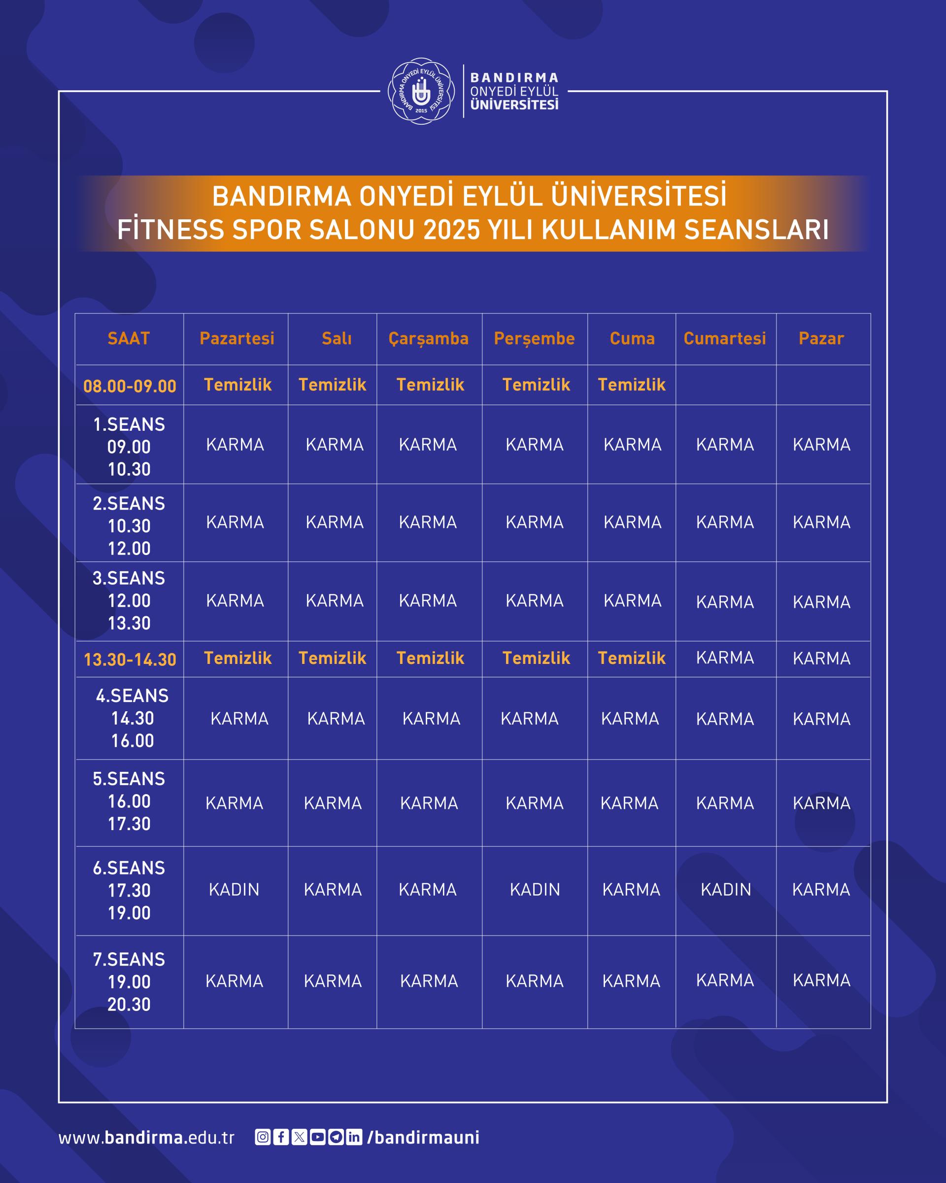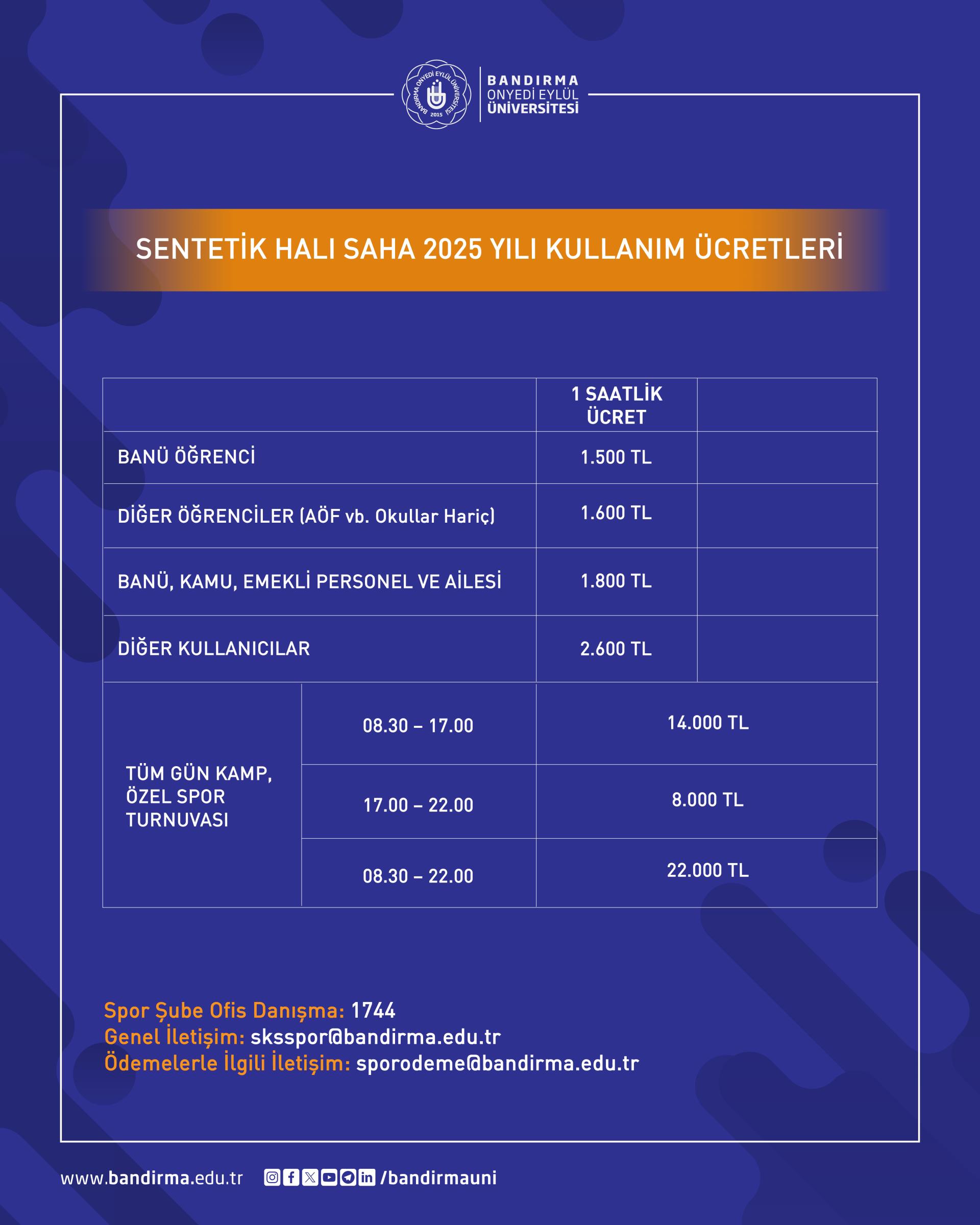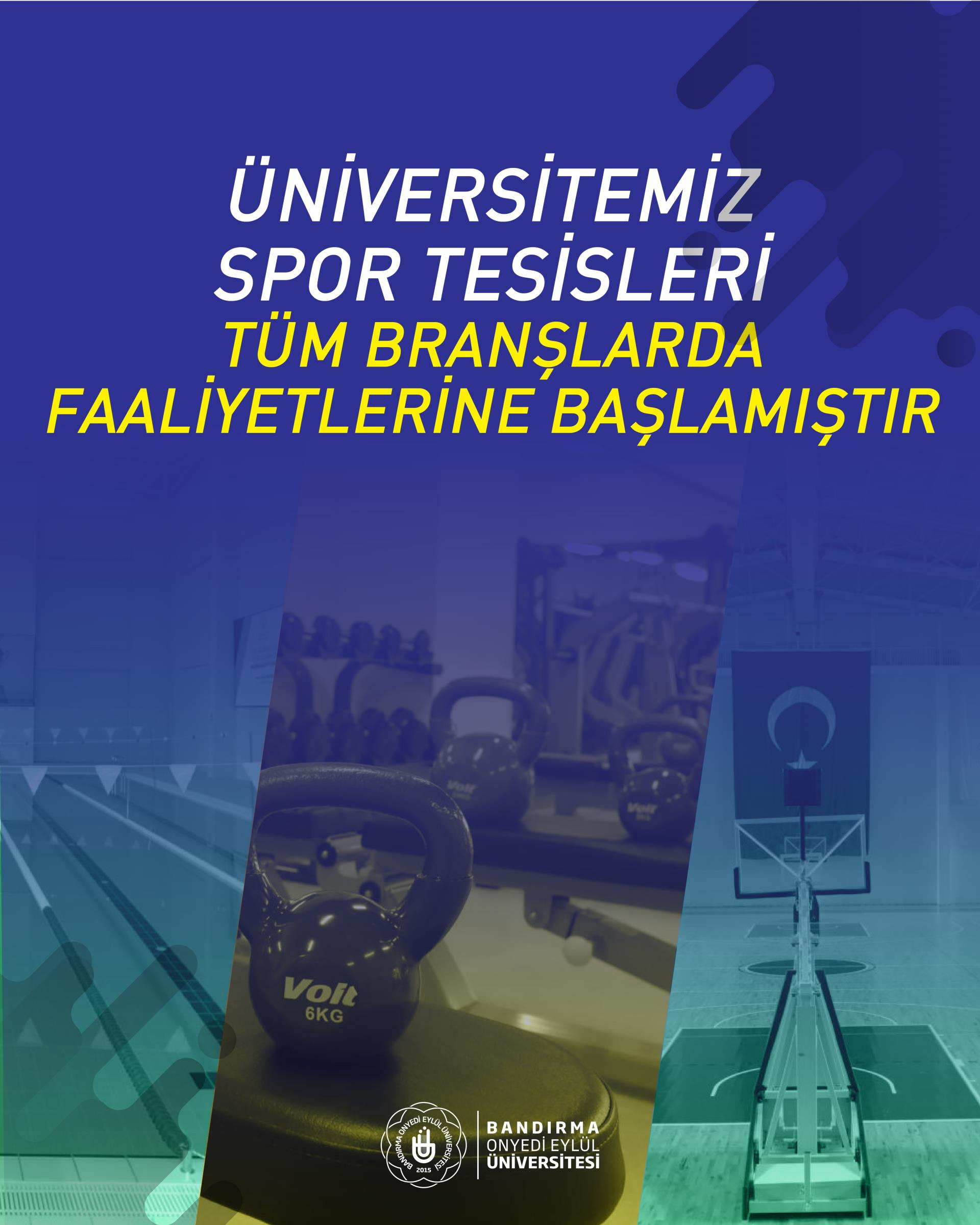 Üniversitemiz Merkez Yerleşkesinde bulunan tüm spor tesisleri, 28 Temmuz 2025 Pazartesi gününden itibaren faaliyetlerine başlamıştır. Geniş katılımcı kitlesine hitap eden bu tesisler; öğrencilerimiz, akademik ve idari personelimiz, personel yakınları ile Bandırma halkının kullanımına açıktır.