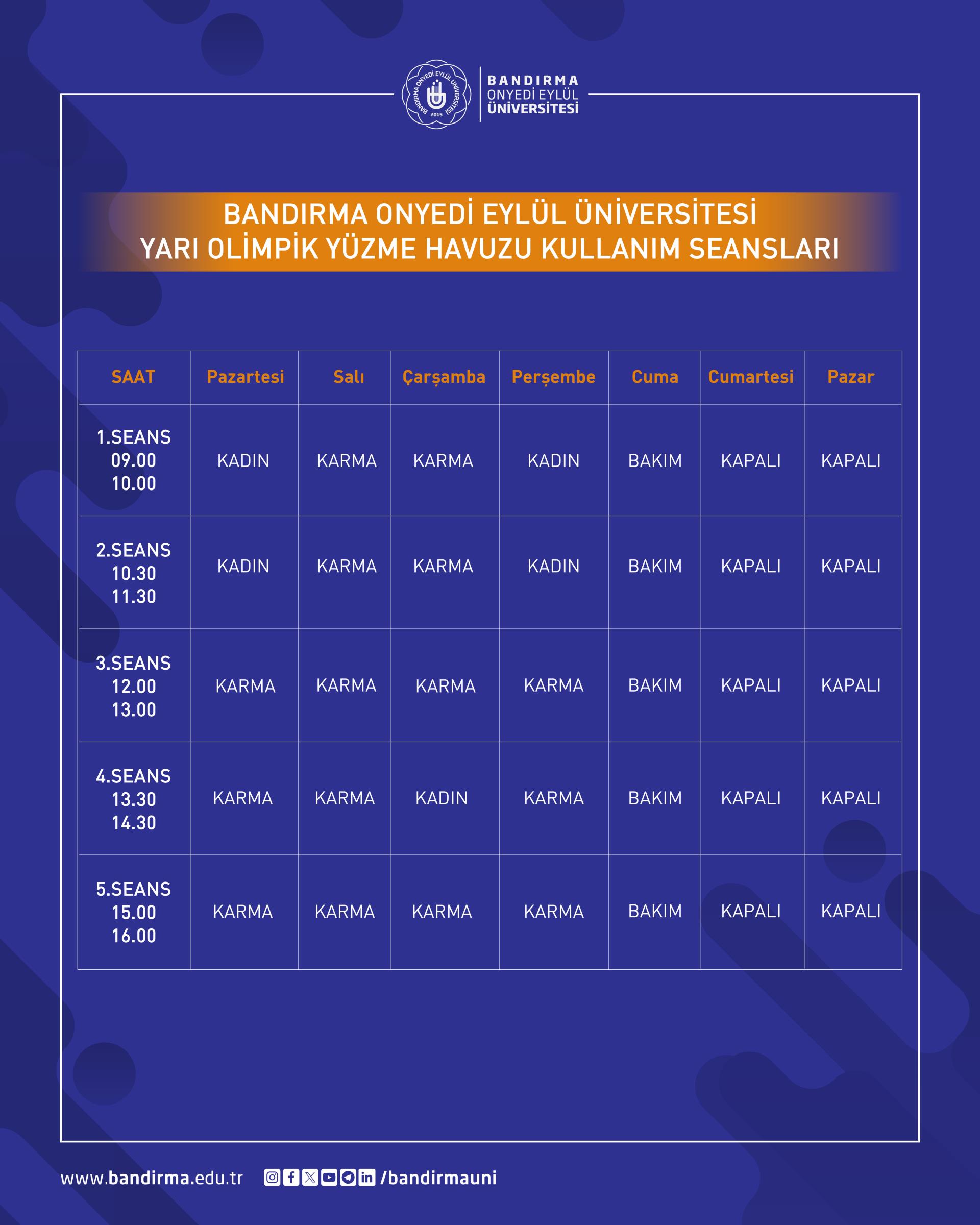 Üniversitemiz Spor Bilimleri Fakültesi bünyesinde ve BANÜ Spor Vadisi'nde yer alan Yarı Olimpik Yüzme Havuzu ise 16 Haziran 2025 Pazartesi günü faaliyete geçmiştir. Modern altyapısı, teknik donanımı ve hijyenik ortamıyla hizmet veren yüzme havuzumuz; çeşitli eğitim programları ve serbest kullanım imkânlarıyla öğrencilerimiz, personelimiz ve aileleri ile Bandırma halkının hizmetindedir.