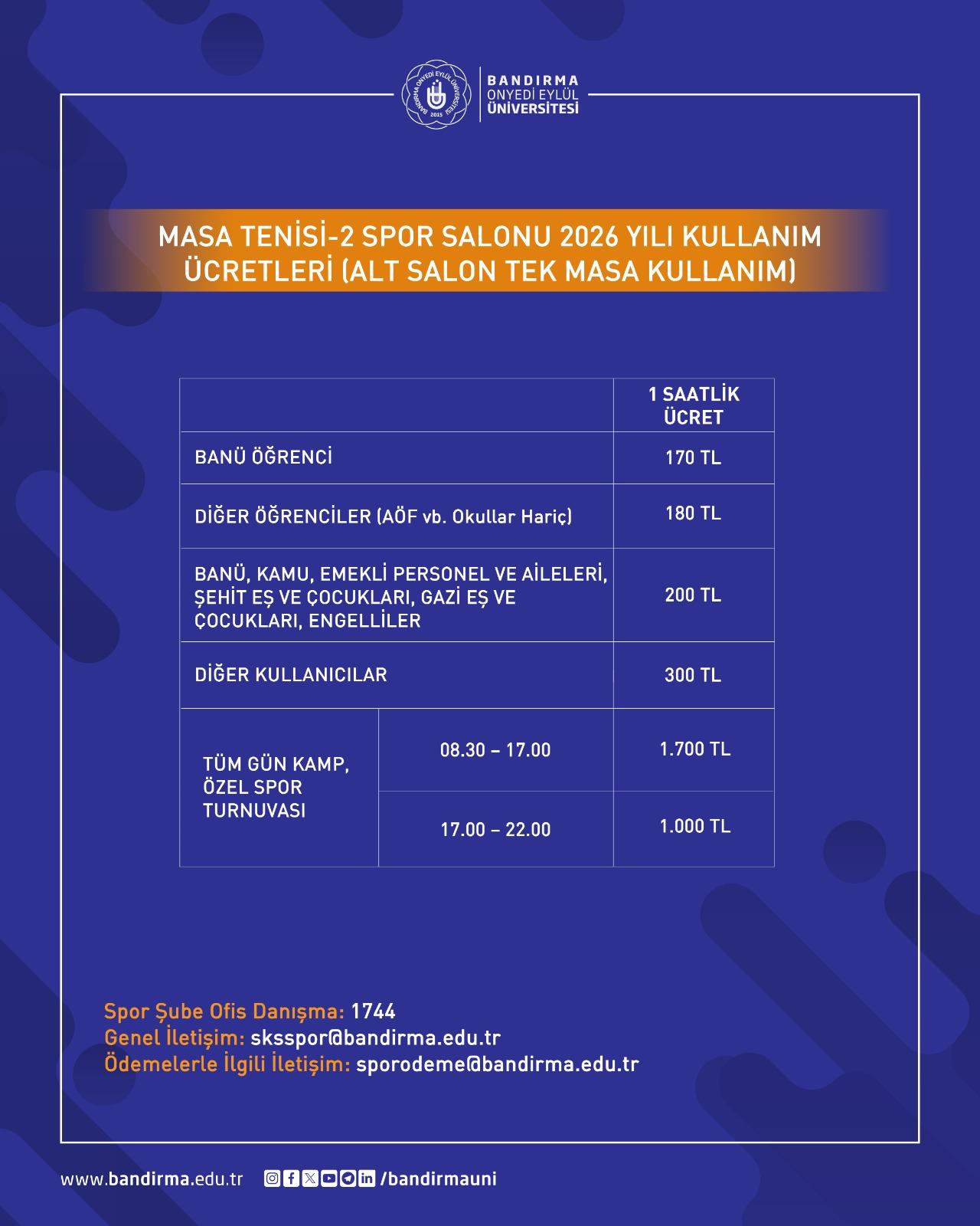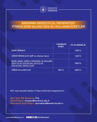 Üniversitemiz Sağlık, Kültür ve Spor Daire Başkanlığı'na bağlı faaliyet gösteren BANÜ Spor Vadisi Tesisleri'nin kullanım ücretleri güncellendi.