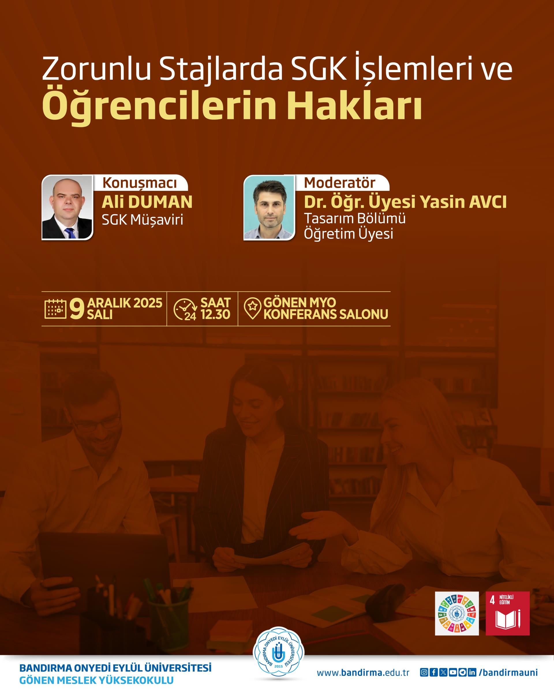 Üniversitemiz Gönen Meslek Yüksekokulu tarafından, öğrencilerimizin zorunlu staj süreçlerinde karşılaştıkları sosyal güvenlik uygulamalarına ilişkin bilgilendirme amacıyla “Zorunlu Stajlarda SGK İşlemleri ve Öğrencilerin Hakları” başlıklı bir söyleşi düzenlenecektir.