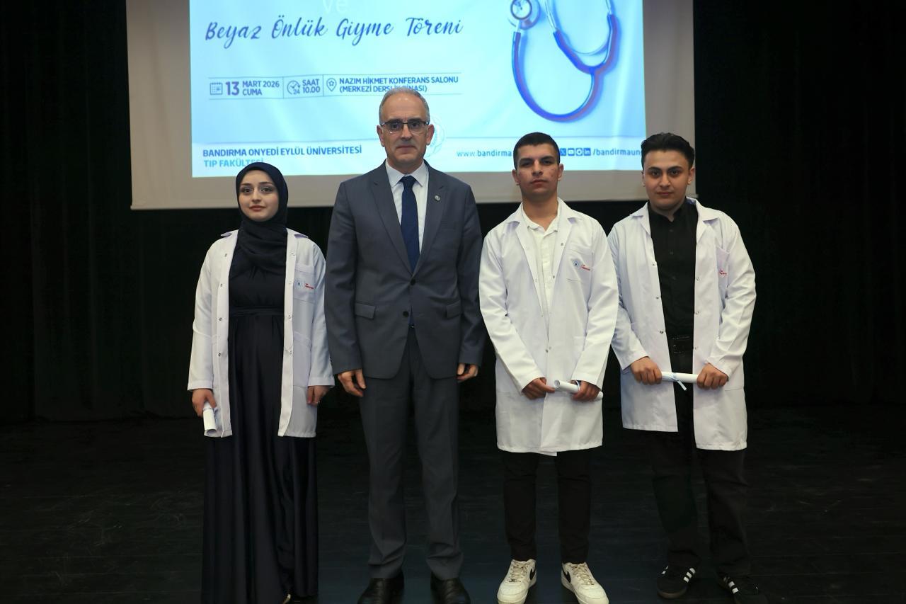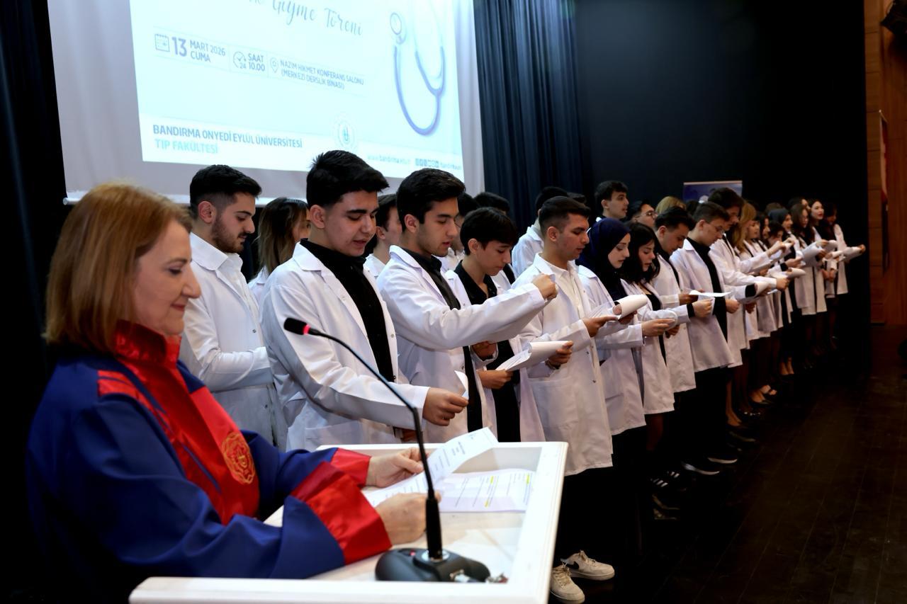 Açılış konuşmalarının ardından Tıp Fakültemizin tanıtım videosu katılımcılara izletildi. Programın devamında gerçekleştirilen Beyaz Önlük Giyme Töreni kapsamında, Tıp Fakültemiz 1. sınıf öğrencilerine beyaz önlükleri Rektörümüz Prof. Dr. İsmail Boz, Prof. Dr. Alpaslan Serel, Prof. Dr. Ebru Kaya Mutlu, Prof. Dr. Mehmet Emin Erçakar, Tıp Fakültesi Dekanımız Prof. Dr. Ayşe Güldem Kilciler, Bandırma Eğitim ve Araştırma Hastanesi Başhekimimiz Dr. Öğr. Üyesi Nart Görgü başta olmak üzere öğretim üyelerimiz tarafından giydirildi.