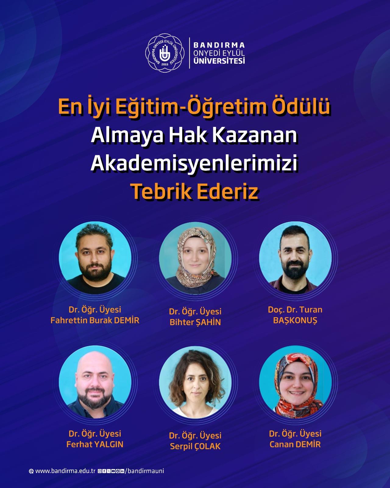 Üniversitemiz En İyi Eğitim-Öğretim Yönergesi doğrultusunda, Ödül Değerlendirme Komisyonu tarafından gerçekleştirilen değerlendirmeler sonucunda; Mühendislik ve Doğa Bilimleri Fakültesi’nden Dr. Öğr. Üyesi Fahrettin Burak Demir, Susurluk Tarım ve Orman Meslek Yüksekokulu’ndan Dr. Öğr. Üyesi Bihter Şahin, Spor Bilimleri Fakültesi’nden Doç. Dr. Turan Başkonuş, Denizcilik Meslek Yüksekokulu’ndan Dr. Öğr. Üyesi Ferhat Yalgın, Sağlık Hizmetleri Meslek Yüksekokulu’ndan Dr. Öğr. Üyesi Serpil Çolak ve Sağlık Bilimleri Fakültesi’nden Dr. Öğr. Üyesi Canan Demir ödüle layık görüldü.
