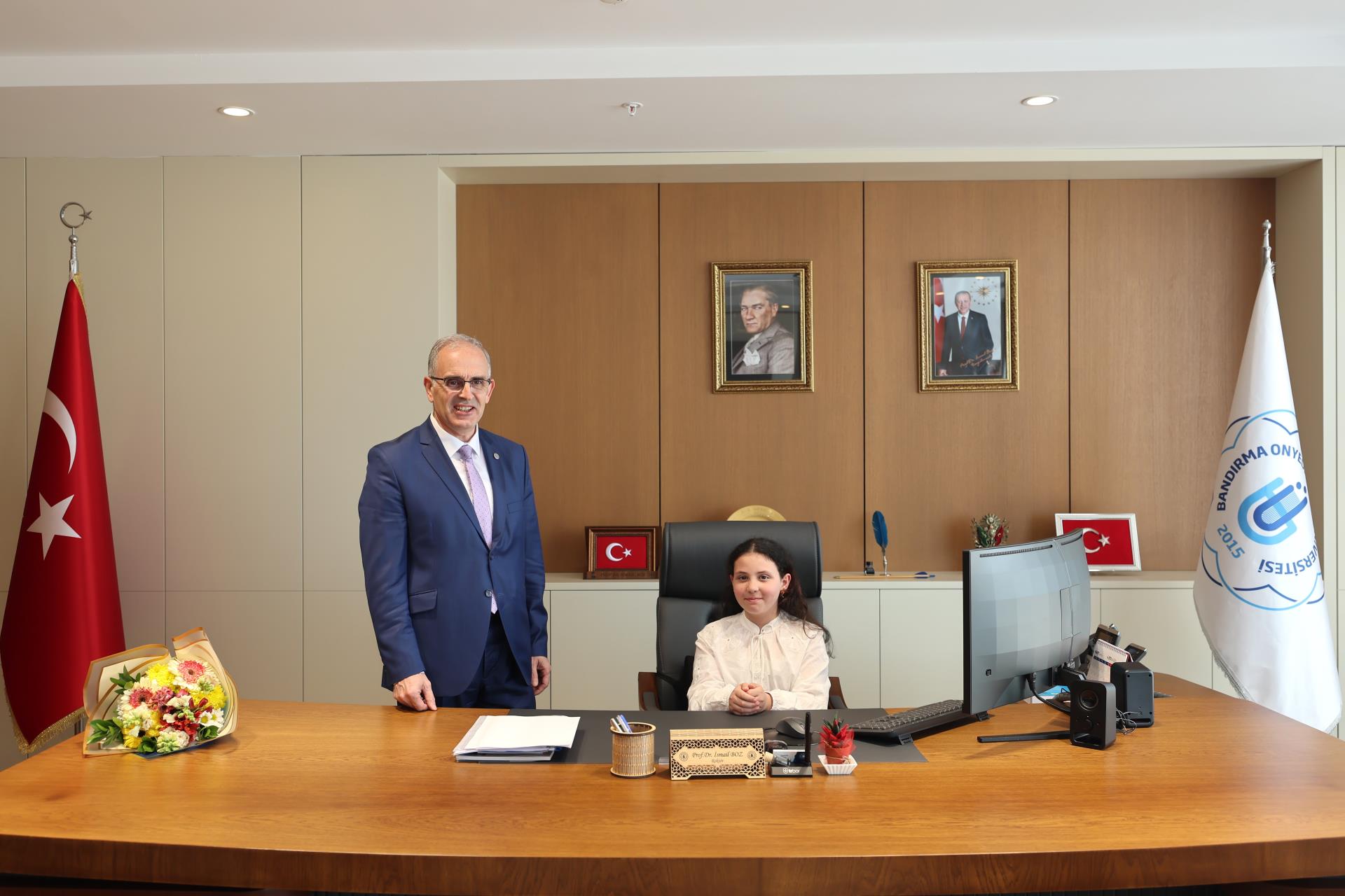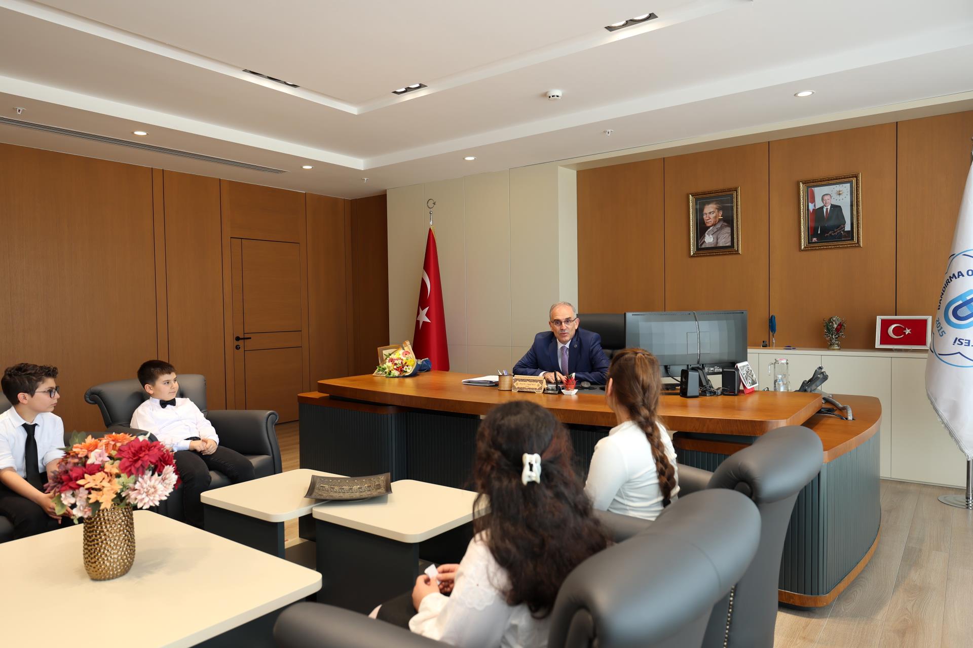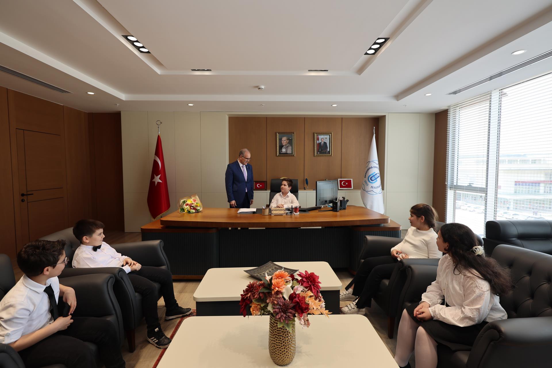 23 Nisan Ulusal Egemenlik ve Çocuk Bayramı dolayısıyla Bandırma Doğa Koleji öğrencileri, Bandırma Doğa Koleji Müdürü Merve Yaman ve İlkokul Müdürü Yavuz Yuvalı eşliğinde Rektörümüz Prof. Dr. İsmail Boz’u makamında ziyaret etti. Neşeli ve anlamlı buluşmada öğrenciler, temsili olarak rektörlük koltuğuna oturarak bayramın coşkusunu yaşadı.