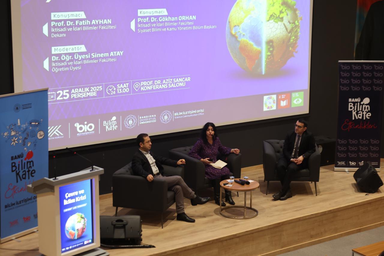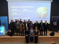 Dr. Öğr. Üyesi Sinem Atay, çevre ve iklim krizine ilişkin dünyada meydana gelen güncel kriz örneklerini aktarırken; Prof. Dr. Gökhan Orhan, “Çevre ve İklim Krizi” başlıklı sunumunda konuyu siyasal ve yönetsel boyutlarıyla ele aldı. Prof. Dr. Fatih Ayhan ise yaptığı sunumda, ülkelerin iklim krizine etkilerini veriler üzerinden değerlendirerek ekonomik ve yapısal sonuçlara dikkat çekti.