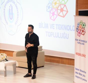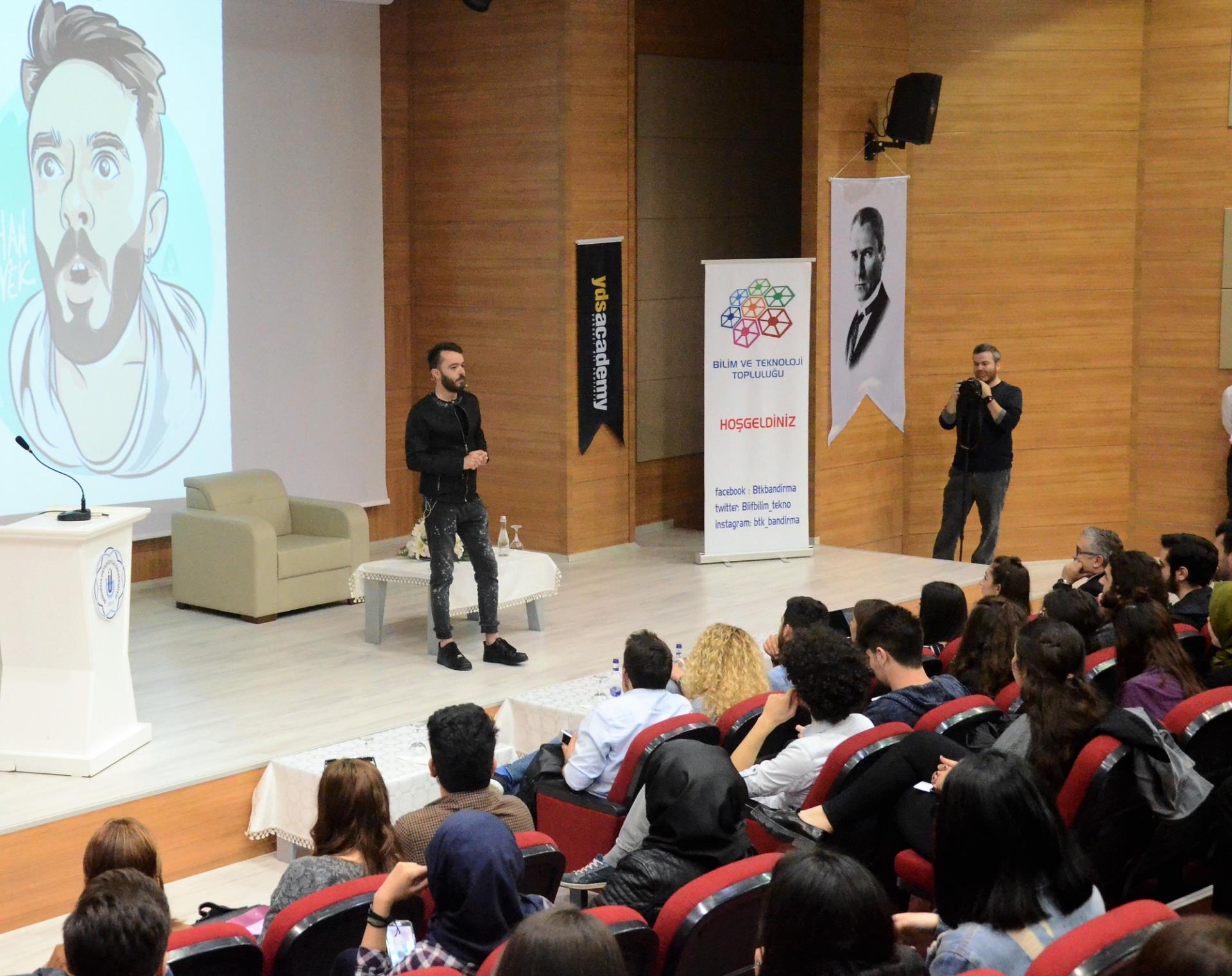 İlk olarak öğrenciler ile buluşan isim 60 üniversitede üyesi bulunan Üniversite Medya Birliği Derneği’nin kurucusu Atakan Şeniz oldu. Şeniz, genç yaşına karşın elde ettiği başarı hikayesini ve dijital dünyada nasıl var olunacağı hakkında bilgiler verdi. Geleneksel medyanın yavaş yavaş popülaritesinin azaldığına dikkat çeken Şeniz; “ Konvansiyonel medya bile artık yavaş yavaş YouTube’a yatırım yapıyor. Bugün yükselen bir YouTube gerçeği var ve aynı şekilde tüm dijital alanlar popülerliğini sürdürmektedir. Dijital o kadar önemli ki, bugün var olan şirketler bu konvansiyonel sistemde dijital varlık yönetimi yapmadan bir iki yıl içinde kaybolmaya mahkûmdurlar. Dijital dünyada güncel olmak gerekiyor ve dünyaya ayak uydurmanız gerekiyor. Bir konuda uzmanlaşmayı kendinize hedef edinmelisiniz. Kendinizi iyi hissettiğiniz, kendinizi gerçekten donanımlı hissedeceğiniz alanlarda uzmanlaşın. Kendi sisteminizi inşa etmeye karar verdiğinizde ise bundan çekinmeden, emek ve vazgeçmeden bu hayalinizi gerçekleştirmek için çalışın.” diye konuştu.