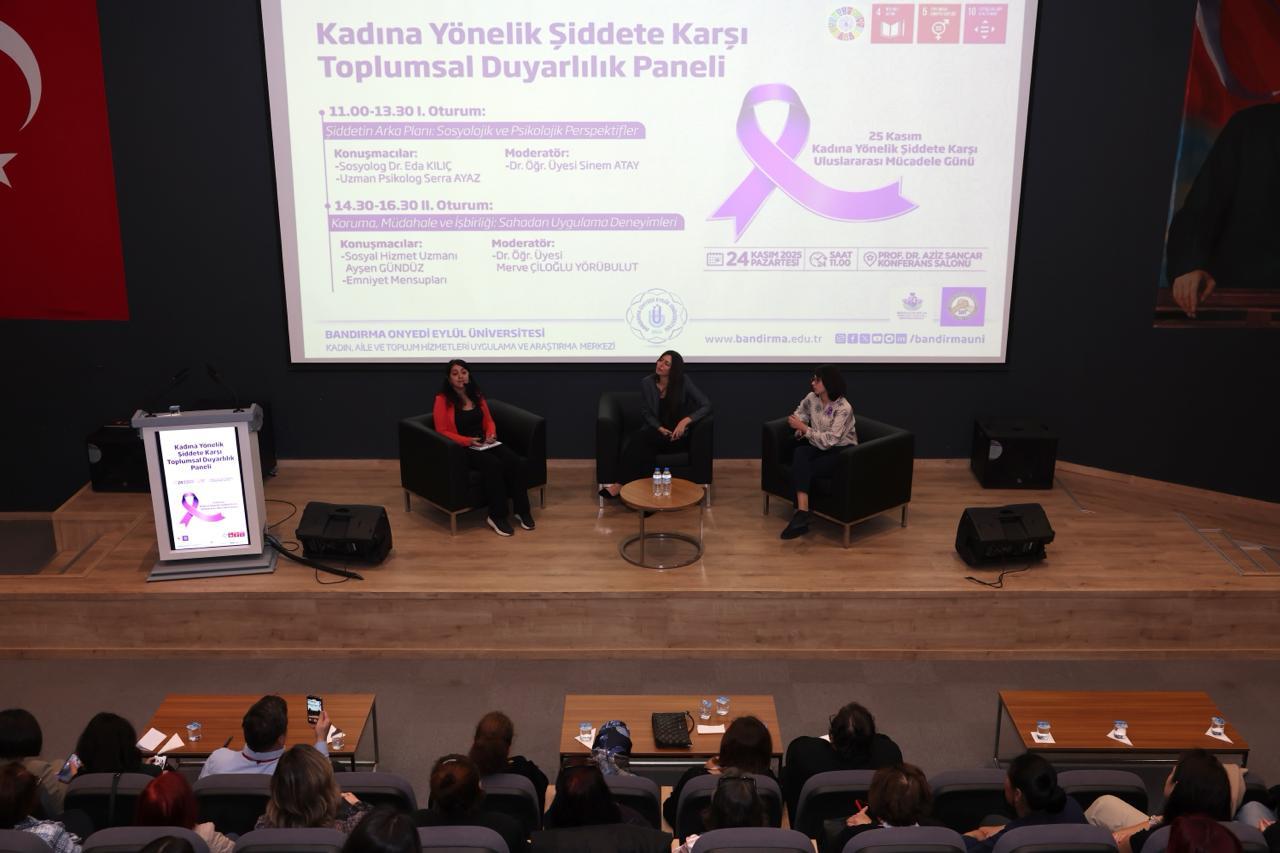 Kadın, Aile ve Toplum Hizmetleri Uygulama ve Araştırma Merkezimiz (BANÜ-KAT) ile Sosyal Hizmet Topluluğumuz tarafından, 25 Kasım Kadına Yönelik Şiddete Karşı Uluslararası Mücadele Günü kapsamında bir panel gerçekleştirildi. Prof. Dr. Aziz Sancar Konferans Salonu’nda gerçekleştirilen panel, saygı duruşu ve İstiklal Marşı’nın okunmasıyla başladı. Programa; Rektörümüz Prof. Dr. İsmail Boz’un eşi Sibel Boz, İktisadi ve İdari Bilimler Fakültesi Dekanımız Prof. Dr. Serap Palaz Çakır, öğretim üyelerimiz, kadın dernekleri temsilcileri, basın mensupları ile öğrencilerimiz katılım sağladı.