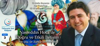 Yerelden evrensele uzanan yolda, Nasreddin Hoca'nın hayata dair söyleyeceklerini her yaştan ve her kesimden insanımıza aktarmak amacıyla yapılan programı 13 hafta boyunca her Pazartesi saat 15:15’te Yunus Emre Enstitüsü Türkçenin Sesi Radyosu’nda keyifle dinleyebilirsiniz.