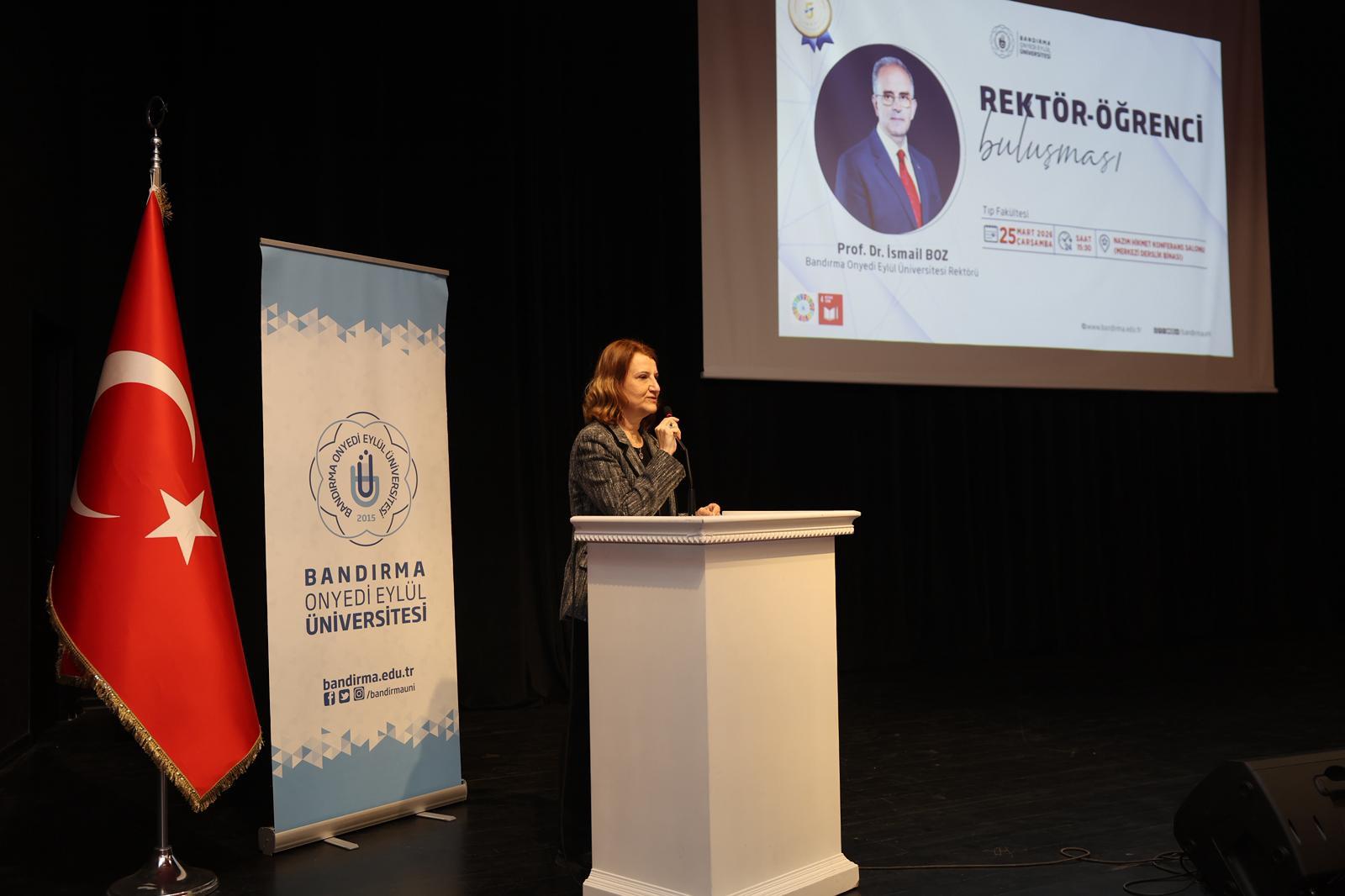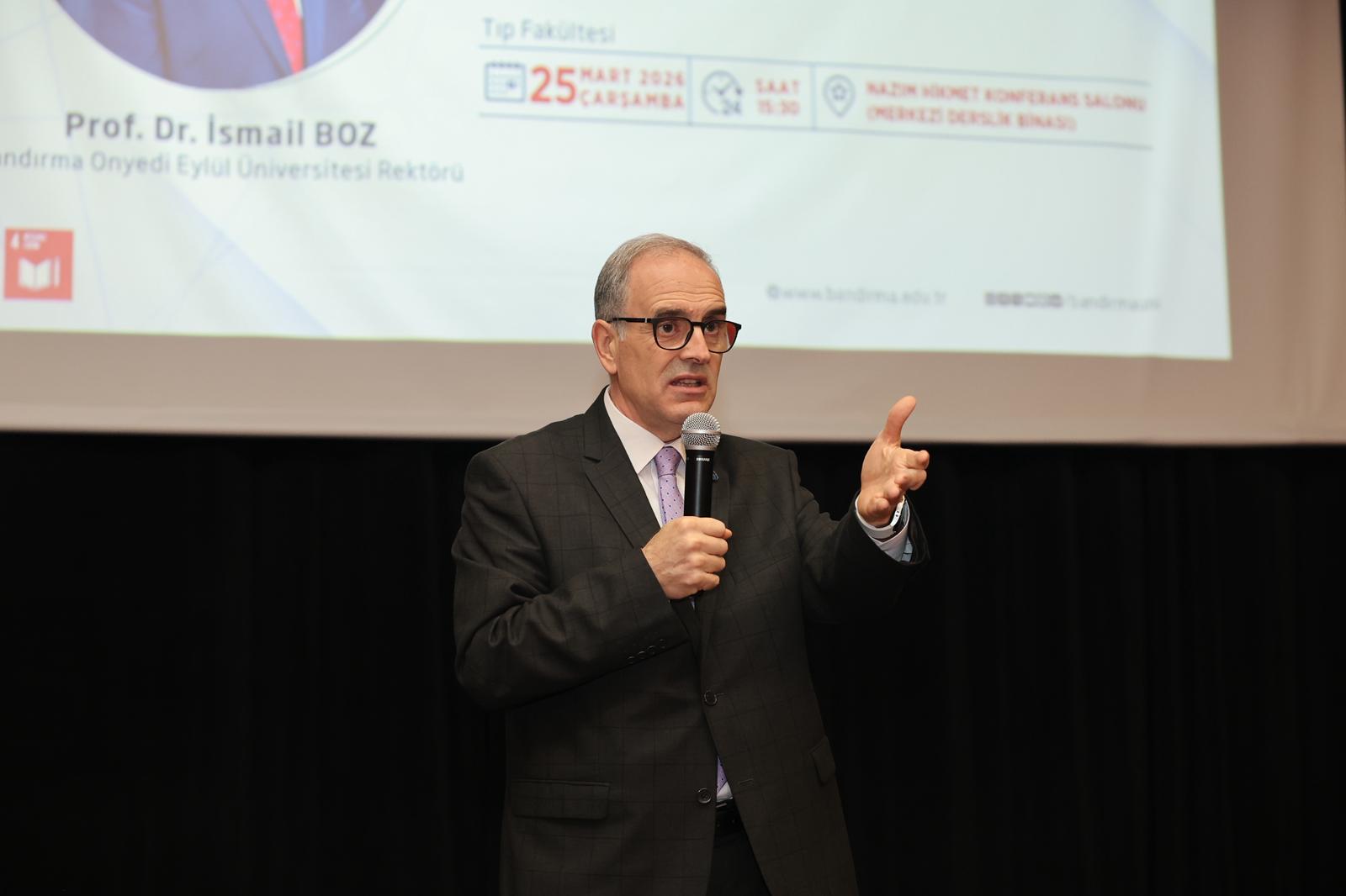 Programda konuşan Rektörümüz Prof. Dr. İsmail Boz, öğrencilerimizin görüş ve önerilerinin üniversite yönetimi açısından yol gösterici nitelik taşıdığını vurgulayarak, “Sorunları birlikte tespit etmek ve ortak akılla çözüm üretmek önceliğimizdir.” ifadelerini kullandı. Tıp Fakültemizin, nitelikli hekimler yetiştirme misyonunun yanı sıra sağlık alanında bilimsel üretime önemli katkılar sunduğunu belirten Rektörümüz, Bandırma Eğitim ve Araştırma Hastanesi ile yürütülen güçlü iş birliğinin hem öğrencilerimizin uygulamalı eğitim süreçlerine hem de bölge halkına sunulan sağlık hizmetlerinin kalitesine büyük değer kattığını ifade etti.