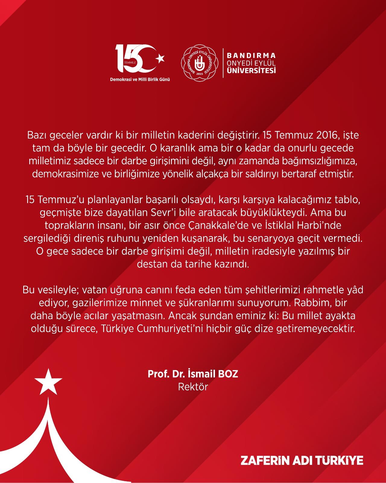 Ben de bir üniversite rektörü olmanın ötesinde, bu yüce milletin bir ferdi olarak, o gece meydanlarda dimdik duran herkesle aynı duyguları yaşadım. Bu milletle aynı safta yürümekten, aynı selaya kulak verip aynı duaya “âmin” demekten gurur duyuyorum.