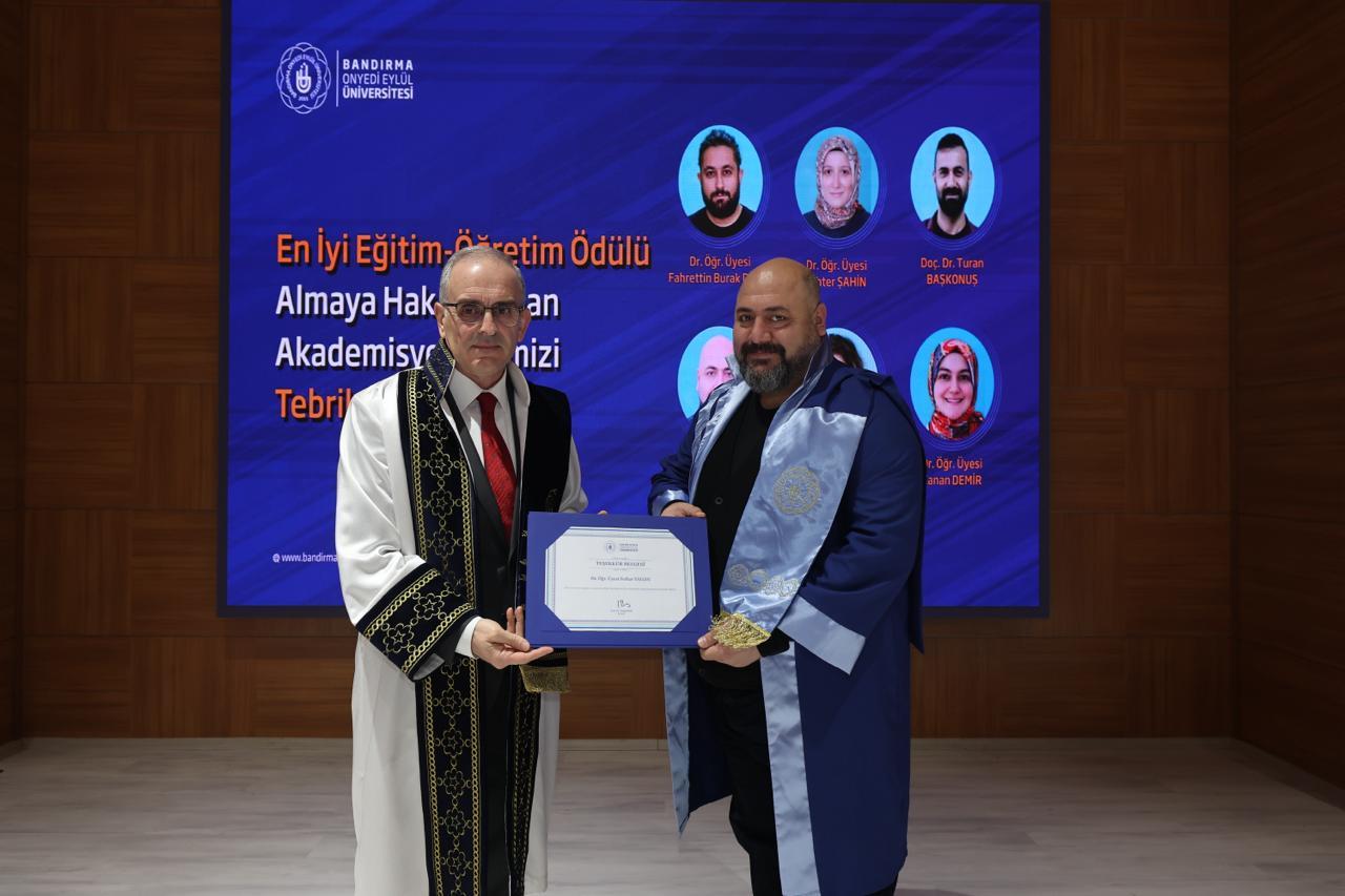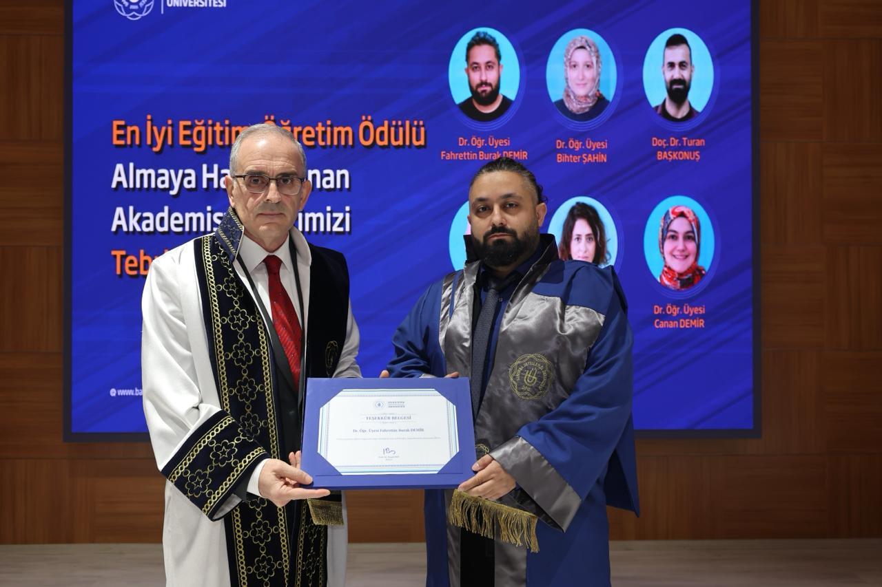 Tören kapsamında, Üniversitemizde eğitim-öğretim faaliyetlerinde kaliteyi teşvik etmek ve akademik başarıyı desteklemek amacıyla yürütülen süreç doğrultusunda “En İyi Eğitim-Öğretim Ödülü” almaya hak kazanan öğretim üyelerimize belgeleri Rektörümüz Prof. Dr. İsmail Boz tarafından takdim edildi.