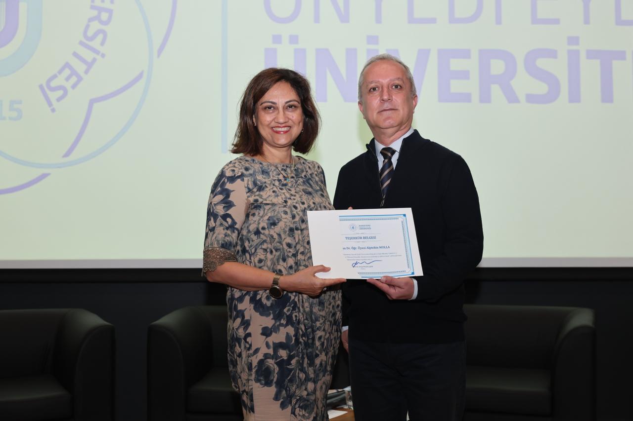 Programın sonunda, İktisadi ve İdari Bilimler Fakültesi Dekanımız Prof. Dr. Serap Palaz ve Dekan Yardımcısı Prof. Dr. Fatih Ayhan tarafından panelin moderatörlüğünü üstlenen Prof. Dr. İsmail Şahin'e, panele konuşmacı olarak katkı sağlayan Prof. Dr. Zeynep Yücel ve Dr. Öğr. Üyesi Alptekin Molla'ya teşekkür belgeleri takdim edildi.
