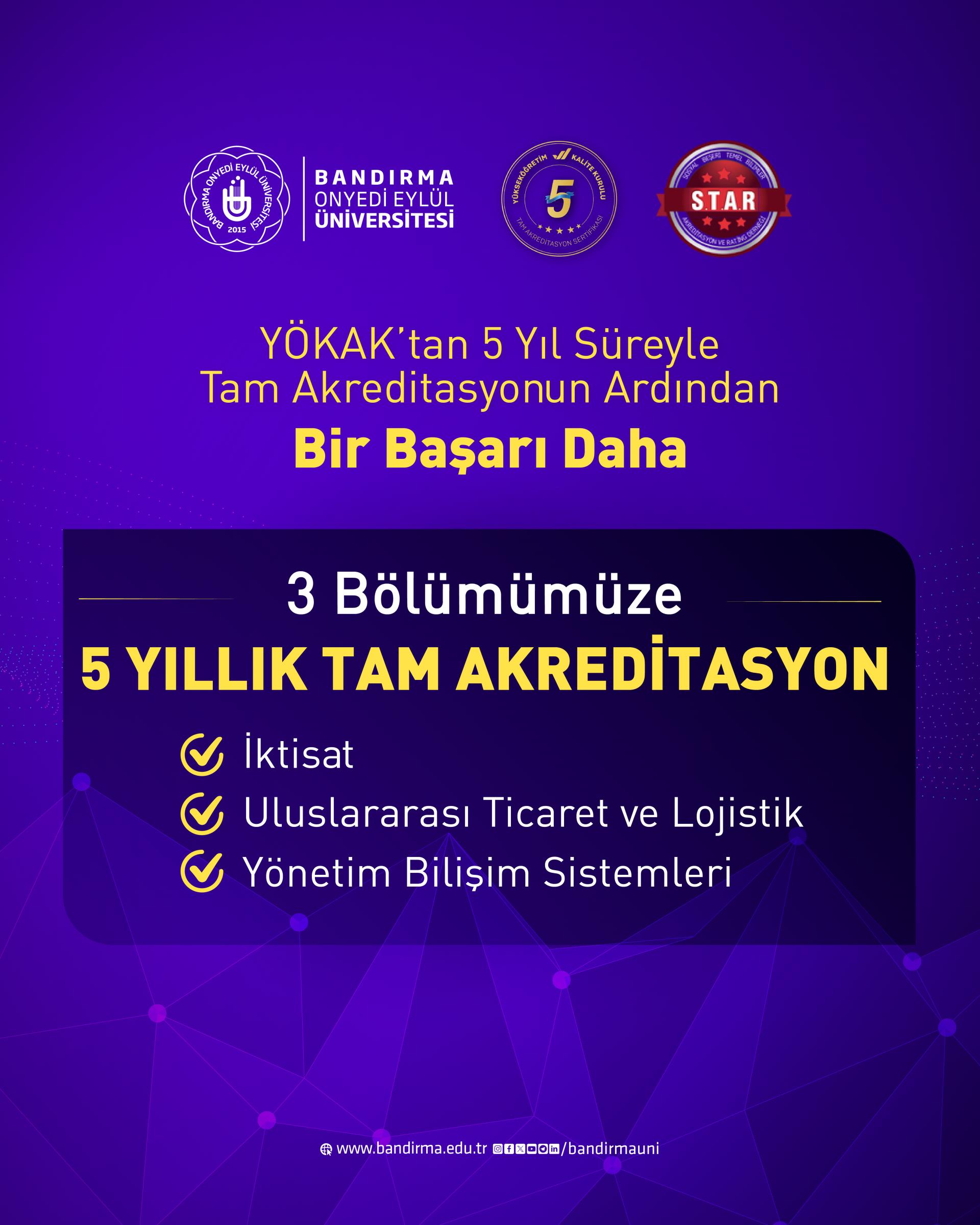 Üniversitemiz önemli bir başarıya daha imza attı. Yükseköğretim Kalite Kurulu (YÖKAK) tarafından alınan “5 yıl süreyle Tam Akreditasyon” başarısının ardından, kalite odaklı eğitim anlayışının somut bir yansıması olarak Üniversitemizin üç farklı bölümü de Sosyal Beşeri Temel Bilimler Akreditasyon ve Rating Derneği (STAR) tarafından yapılan değerlendirme sonucu 5 yıllık Tam Akreditasyon alma başarısını gösterdi.