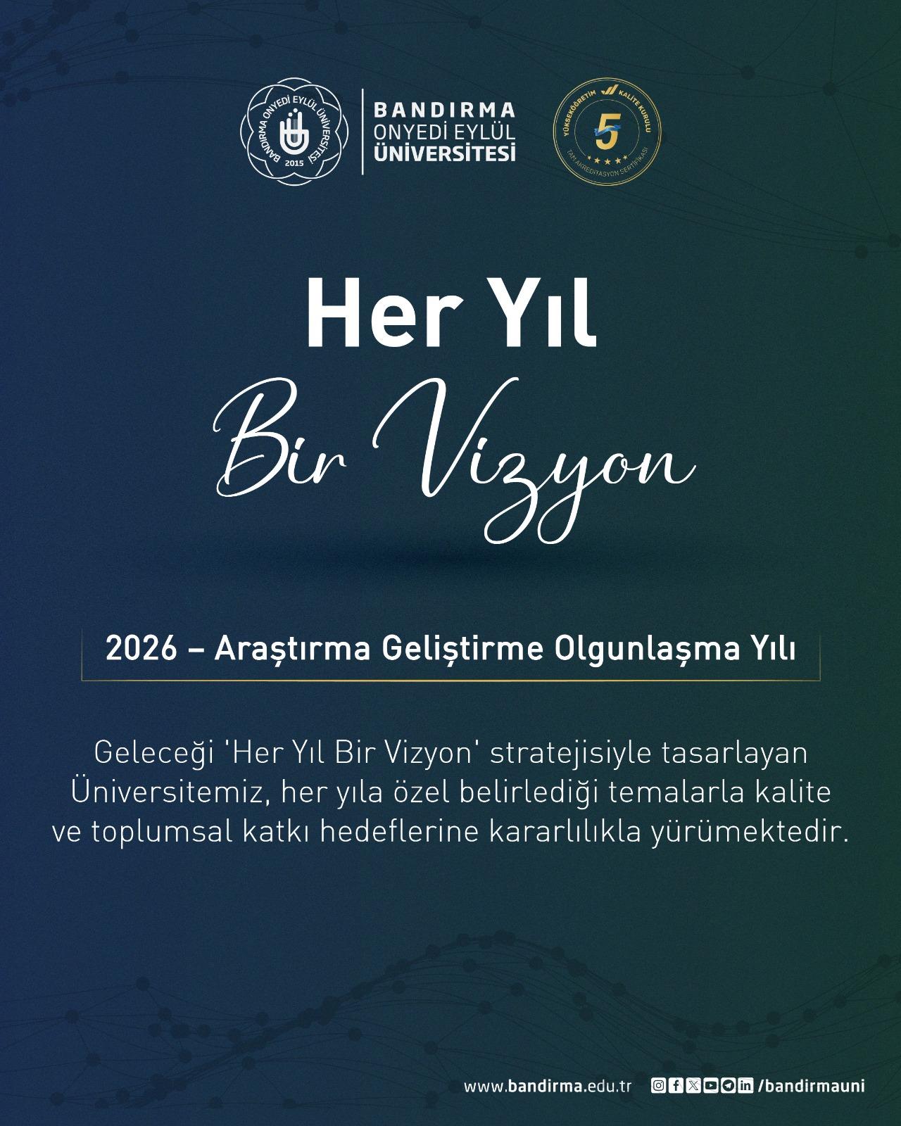 Üniversitemizin gelecekte küresel ve bölgesel rekabet gücünü arttırabilmesi ve sürdürülebilmesi amacıyla “Türkiye Yüzyılı” vizyonu doğrultusunda, ‘kalite ve üretkenlik’; ‘araştırma ve yenilikçilik’ ve ‘uluslararasılaşma’ hedefleri doğrultusunda kararlılıkla hareket ediyoruz. Bu çerçevede 2026 yılını üniversitemizde “Araştırma Geliştirme Olgunlaşma Yılı” ilan ettiğimizi büyük bir inanç ve kararlılıkla kamuoyuna duyuruyorum.