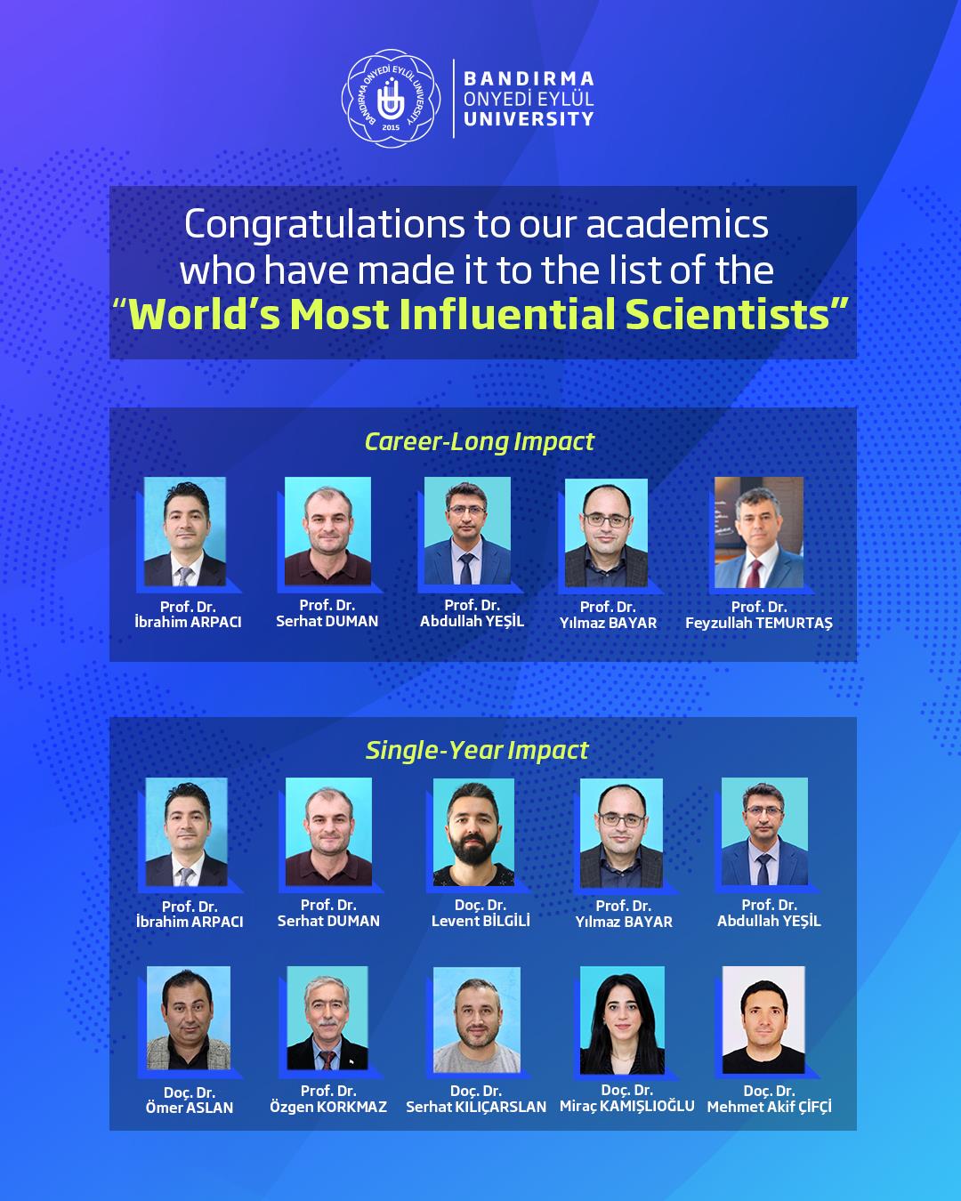 In this prestigious list, academicians are included in two different categories: “Career-Long Impact” and “Single-Year Impact.” In the Career-Long Impact category, our Faculty of Engineering and Natural Sciences Members Prof. Dr. Abdullah Yeşil, Prof. Dr. İbrahim Arpacı, Prof. Dr. Serhat Duman, and Prof. Dr. Feyzullah Temurtaş, and our Faculty of Economics and Administrative Sciences Member Prof. Dr. Yılmaz Bayar were included, while in the Single-Year Impact category, our Faculty of Engineering and Natural Sciences Members Prof. Dr. Abdullah Yeşil, Prof. Dr. İbrahim Arpacı, Prof. Dr. Serhat Duman, Prof. Dr. Özgen Korkmaz, Assoc. Prof. Dr. Ömer Aslan, Assoc. Prof. Dr. Serhat Kılıçarslan, and Assoc. Prof. Dr. Mehmet Akif Çiftçi, our Faculty of Economics and Administrative Sciences Member Prof. Dr. Yılmaz Bayar, our Faculty of Maritime Studies Member Assoc. Prof. Dr. Levent Bilgili, and our Vocational School of Health Services Member Assoc. Prof. Dr. Miraç Kamışlıoğlu were included.