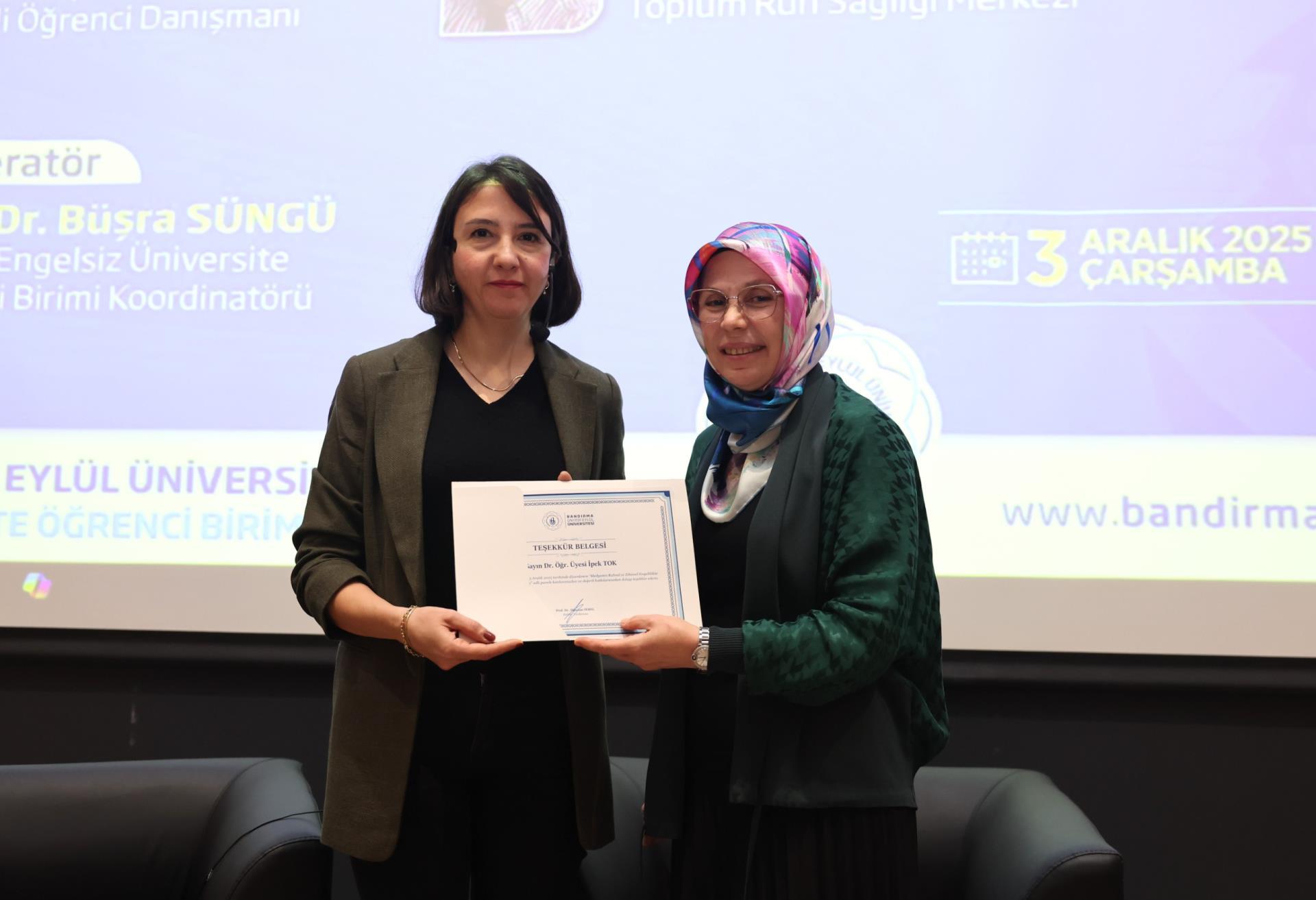 The program was moderated by Assoc. Prof. Dr. Büşra Süngü and featured Dr. İpek Tok, a faculty member of the Faculty of Communication, and Psychologist Murat Yatmaz from the Community Mental Health Center of Bandırma Training and Research Hospital as speakers. The speakers addressed how media representations shape societal perceptions of mental and intellectual disabilities, the mechanisms of stigmatization, and the reflections of these perceptions on individuals’ daily lives, drawing on scientific evidence.