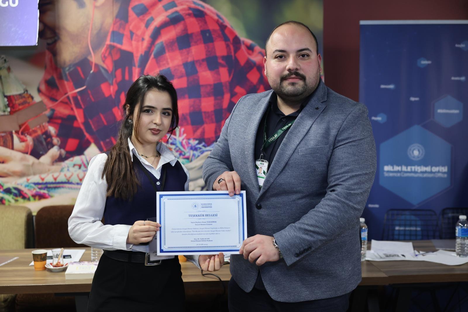 Within the scope of the event, Social Work Specialist Nida İnam from the Bandırma Judicial and Victim Services Department of the Ministry of Justice; Social Work Specialist Hüseyin Eker from Bandırma Training and Research Hospital of the Ministry of Health; Social Work Specialist Ayşen Gündüz from the Bandırma District Social Services Center Directorate of the Ministry of Family and Social Services; and Social Work Specialist Baybars Kaan Yeşilırmak from the Balıkesir Yeşilay Counseling Center jointly analyzed a social work case. The session was moderated by Research Assistant Dr. Mücahit Baykul from our University’s Department of Social Work.