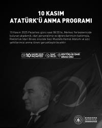 10 Kasım 2025 Pazartesi günü saat 08.55’te, Merkez Yerleşkemizde bulunan akademik, idari personelimiz ve öğrencilerimizin katılımıyla, Rektörlük İdari Binası önünde Gazi Mustafa Kemal Atatürk ve aziz şehitlerimizi anma töreni gerçekleştirilecektir.