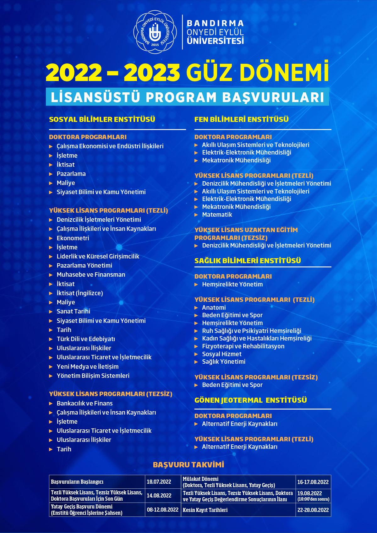 Sosyal Bilimler Enstitüsü, Fen Bilimleri Enstitüsü, Sağlık Bilimleri Enstitüsü ve Gönen Jeotermal Enstitüsü lisansüstü programlarının ve başvuru takviminin bulunduğu tablo aşağıda yer almaktadır.