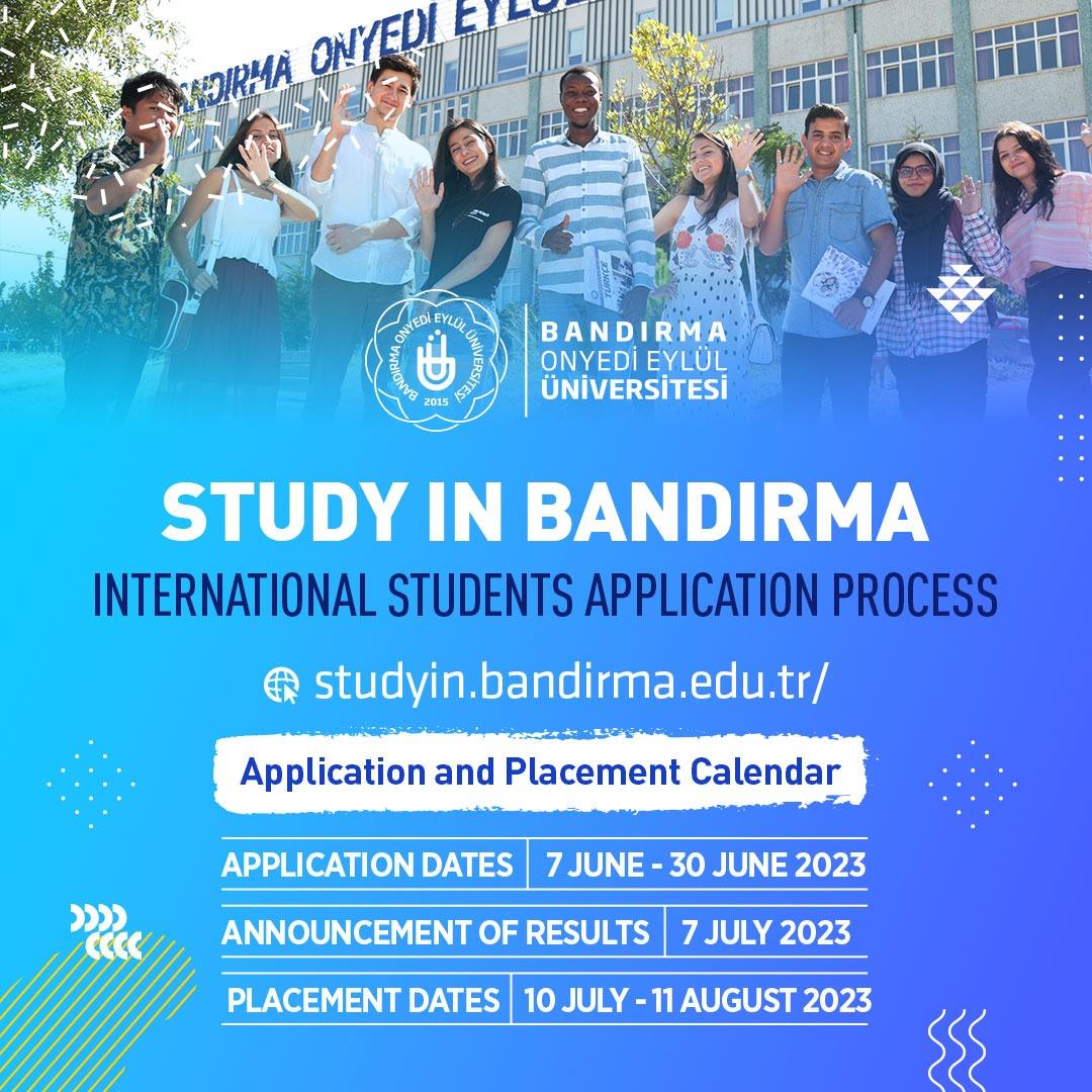 2023-2024 Academic Year Foreign Students Application process for Bandırma Onyedi Eylül University commenced on 07/06/2023. In the light of internationalization, our university opens it doors to the students from all over the World. International exams, YOS exams held by Turkish universities and high school diploma are accepted for Foreign Students Applications. For applications https://obs.bandirma.edu.tr/oibs/ogrsis/basvuru_yabanci_login.aspx