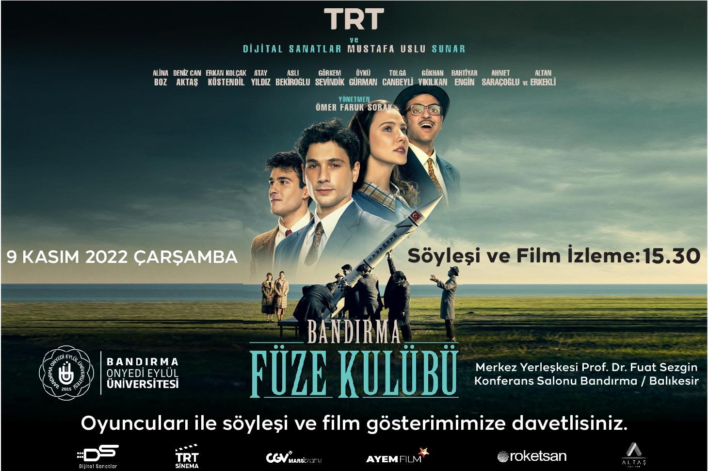 1950’li yıllarda Bandırma’da yaşayan bir grup liseli gencin azim dolu gerçek hikâyesini anlatan ve 21 Ekim tarihinde vizyona giren "Bandırma Füze Kulübü" filmi ekibi Üniversitemize geliyor. 9 Kasım Çarşamba günü saat 15.30'da Prof. Dr. Fuat Sezgin Konferans Salonu’muzda “Bandırma Füze Kulübü” yönetmeni ve oyuncuları ile söyleşi, ardından film gösterimi gerçekleştirilecektir.
