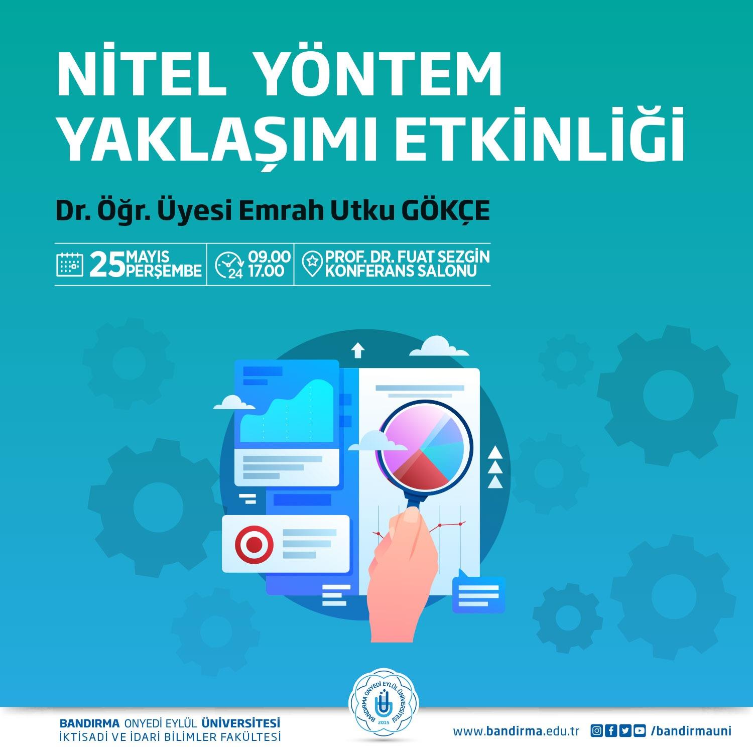 İktisadi ve İdari Bilimler Fakültemiz tarafından 25 Mayıs Perşembe günü 09.00-17.00 saatleri arasında "Nitel Yöntem Yaklaşımı Etkinliği" düzenlenecek. Prof. Dr. Fuat Sezgin Konferans Salonumuzda gerçekleşecek olan etkinliğe Manyas Meslek Yüksekokulu akademisyenlerimizden Dr. Öğr. Üyesi Emrah Utku Gökçe katılacak ve bilimsel çalışmalarda nitel yöntem kullanımı üzerine önemli bilgiler paylaşacak.