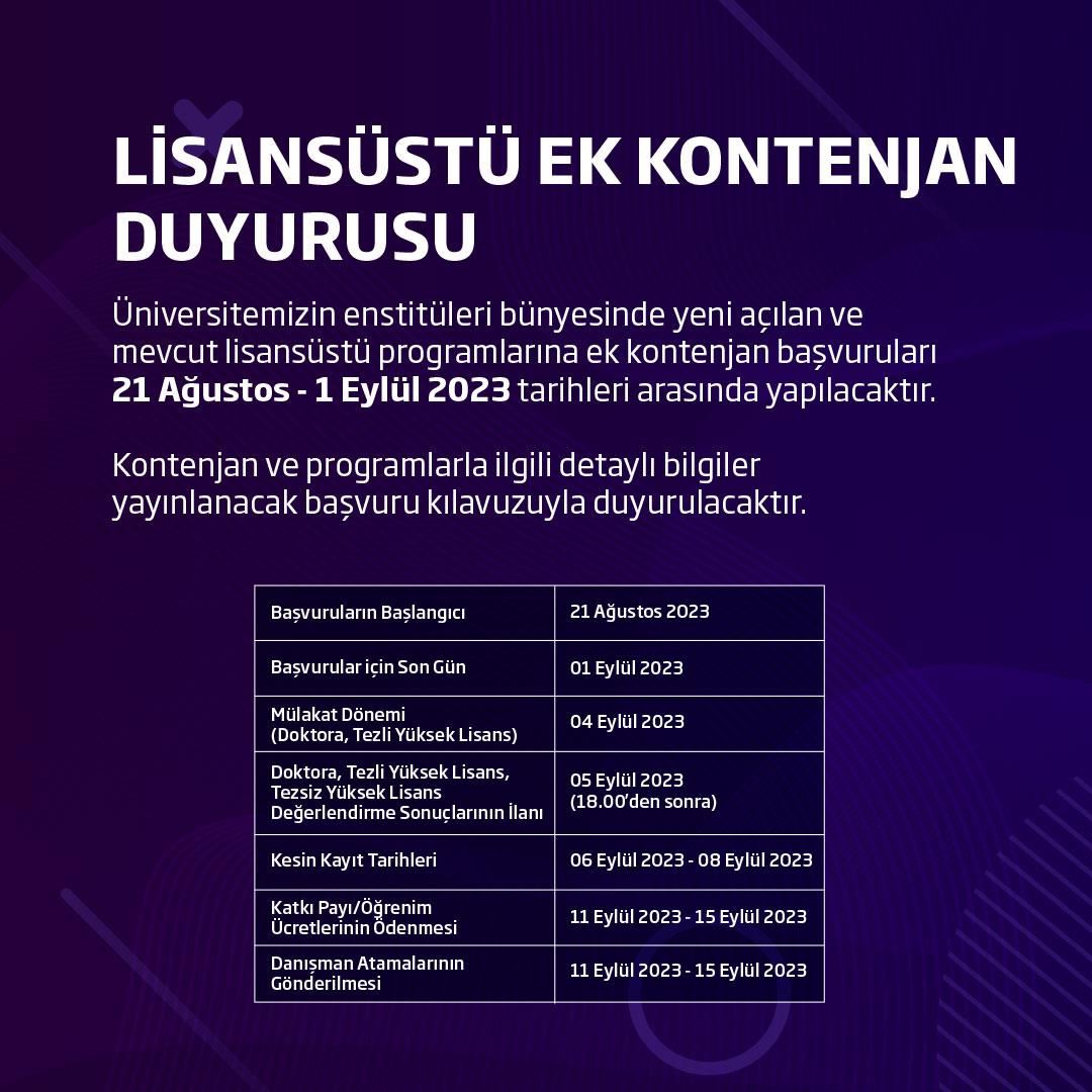 Üniversitemizin enstitüleri bünyesinde yeni açılan ve mevcut lisansüstü programlarına ek kontenjan başvuruları 21 Ağustos - 1 Eylül 2023 tarihleri arasında yapılacaktır. Kontenjan ve programlarla ilgili detaylı bilgiler 21 Ağustos 2023 tarihinde yayınlanacak başvuru kılavuzuyla duyurulacaktır.