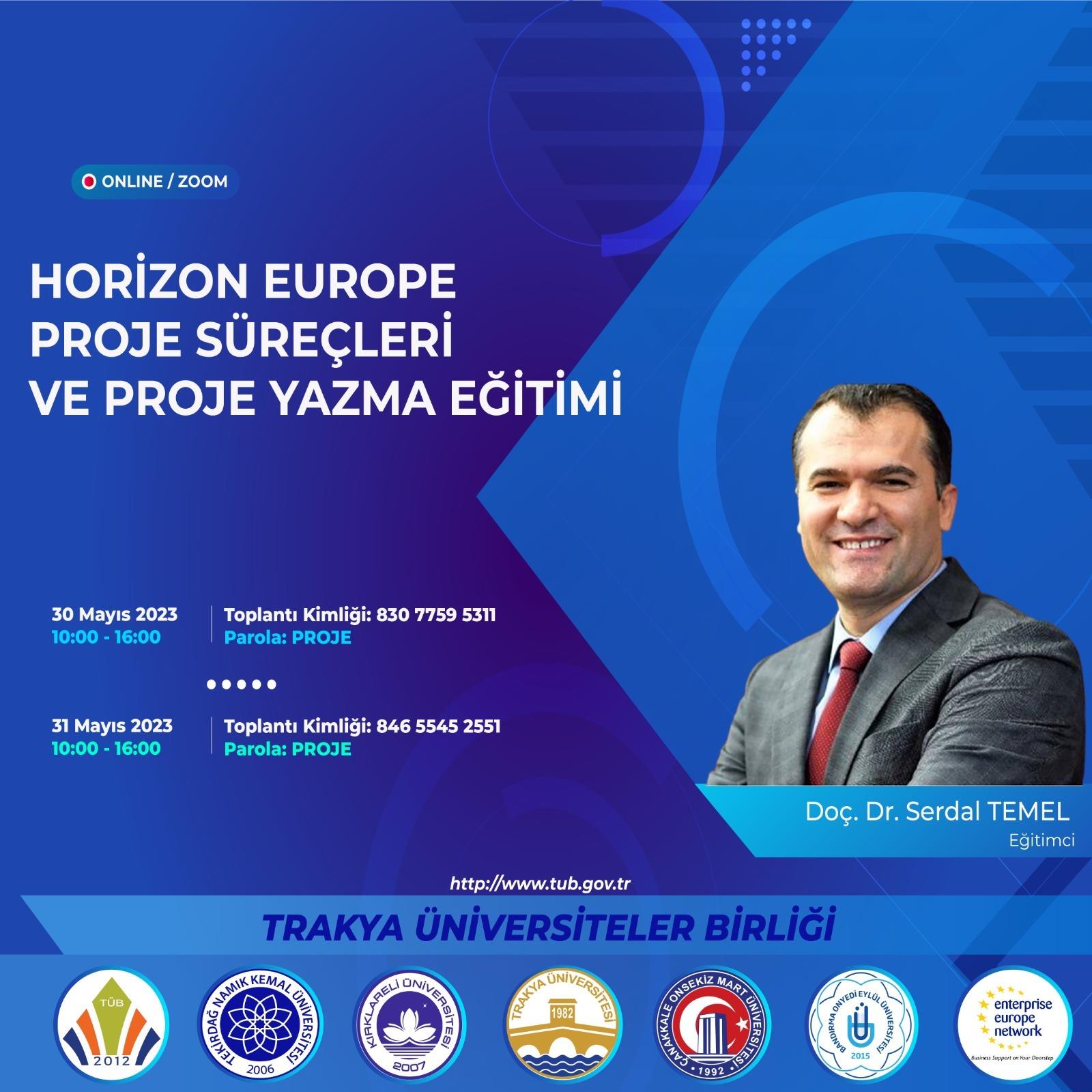 Trakya Üniversiteler Birliği (TÜB) etkinlikleri kapsamında Proje Alt Çalışma Grubu tarafından Horizon Europe Proje Süreçleri ve Proje Yazma Eğitimi düzenlenecek. 30 Mayıs Salı ve 31 Mayıs Çarşamba günü 10.00-16.00 saatleri arasında Zoom Platformu üzerinden çevrim içi gerçekleşecek olan eğitime Ege Üniversitesi Mühendislik Fakültesi Öğretim Üyesi Doç. Dr. Serdar Temel konuşmacı olarak katılacak.
