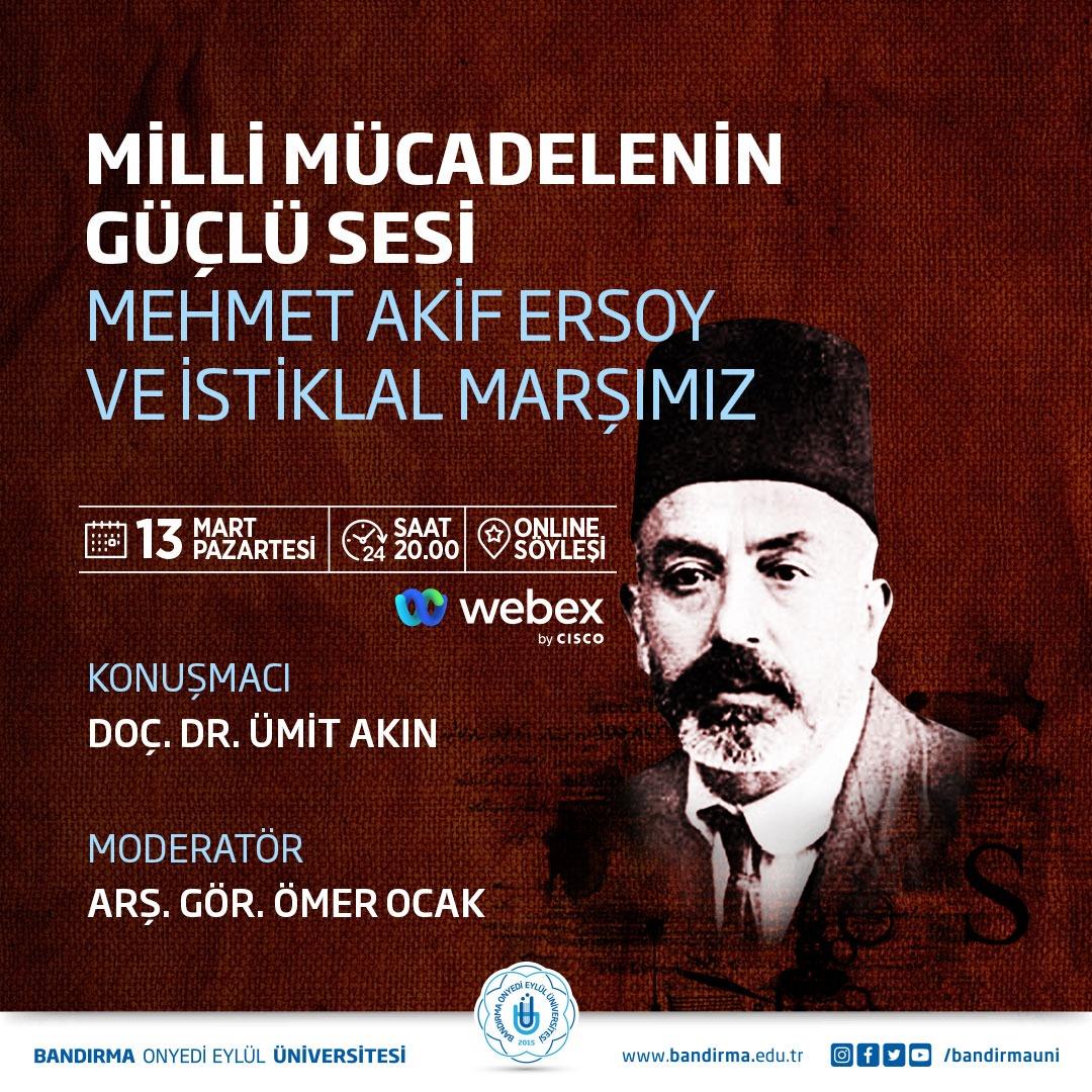 nsan ve Toplum Bilimleri Fakültemiz tarafından İstiklal Marşımızın kabulünün 102. yıl dönümü dolayısıyla “Milli Mücadelenin Güçlü Sesi Mehmet Akif Ersoy ve İstiklal Marşımız” konulu söyleşi düzenlenecek. Moderatörlüğünü İnsan ve Toplum Bilimleri Fakültemiz Arş. Gör. Ömer Ocak’ın üstlendiği programa konuşmacı olarak Çağdaş Türk Lehçeleri ve Edebiyatları Ana Bilim Dalı öğretim üyemiz Doç. Dr. Ümit Akın katılacak. 13 Mart Pazartesi günü (bugün) saat 20.00’de çevrim içi gerçekleşecek programa katılmak için tıklayınız.