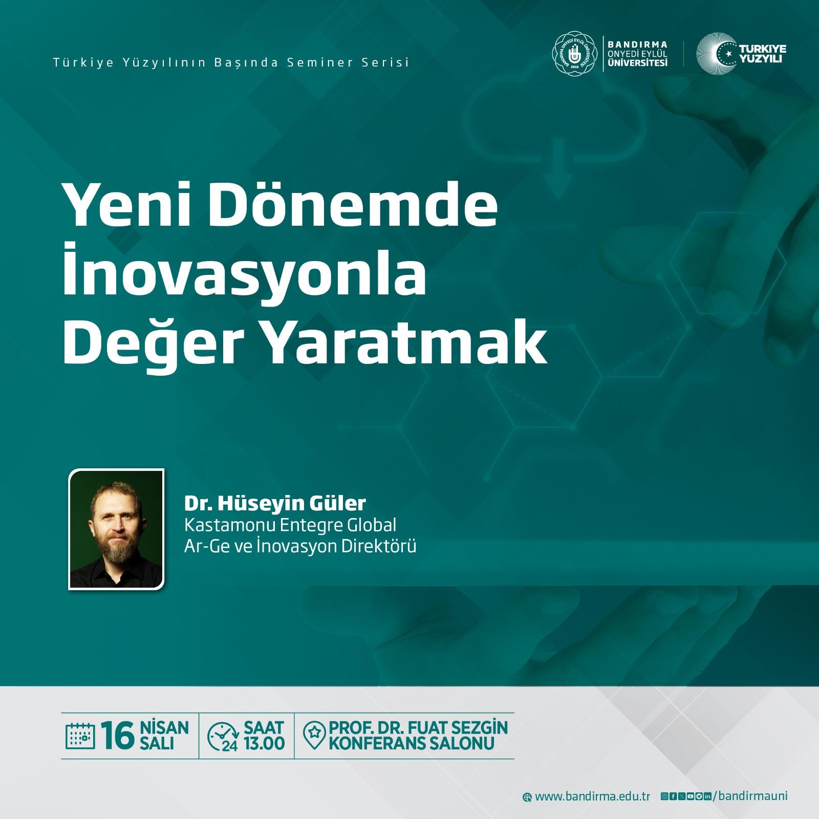 "Türkiye Yüzyılının Başında” seminer serimiz kapsamında “Yeni Dönemde İnovasyonla Değer Yaratmak” konulu konferans düzenlenecektir.