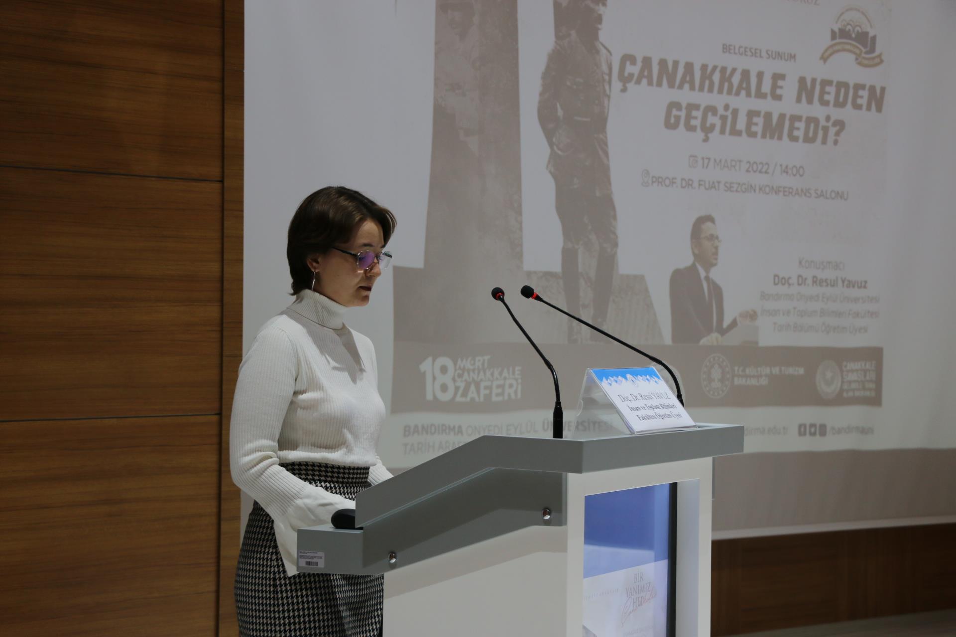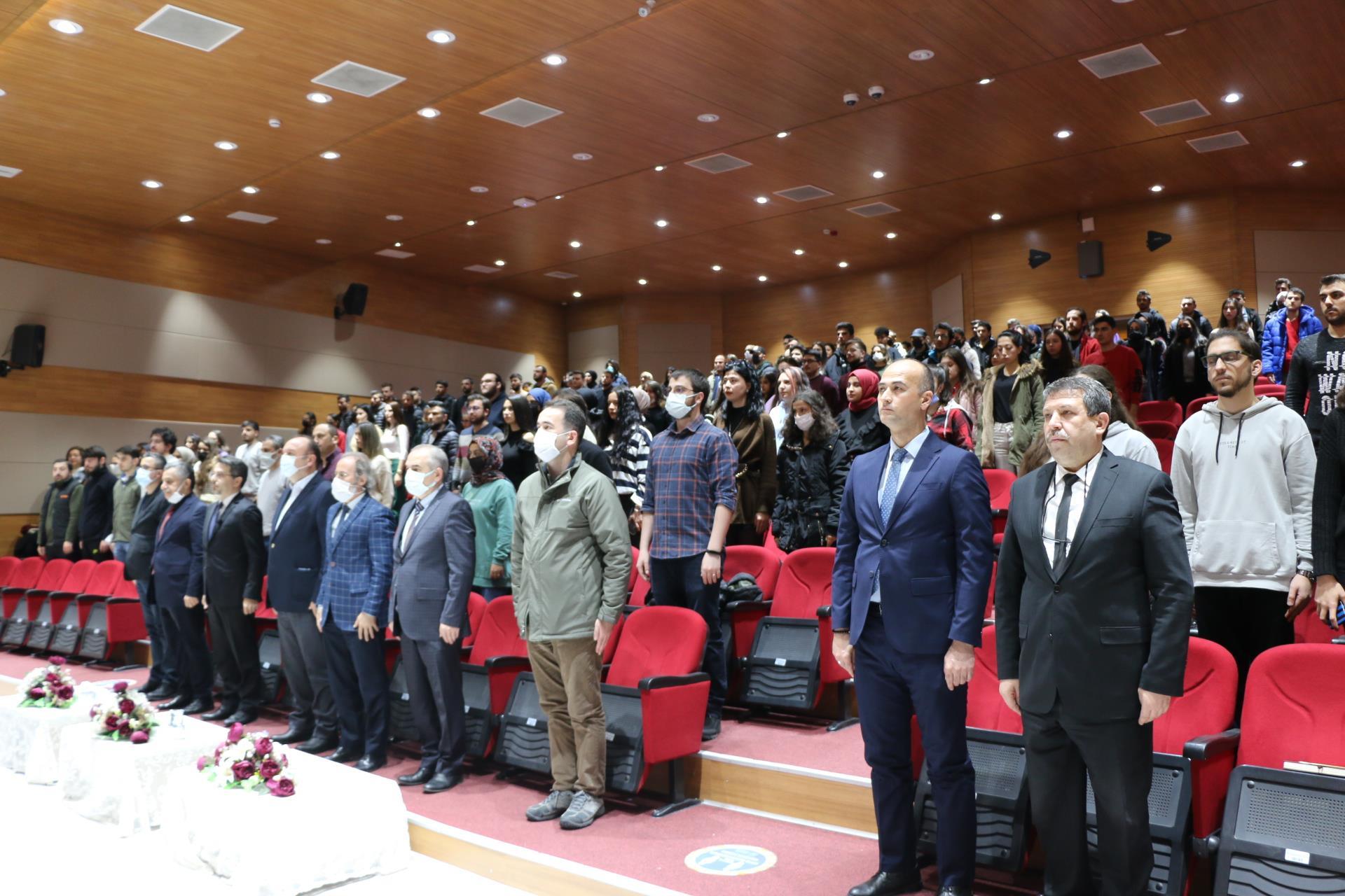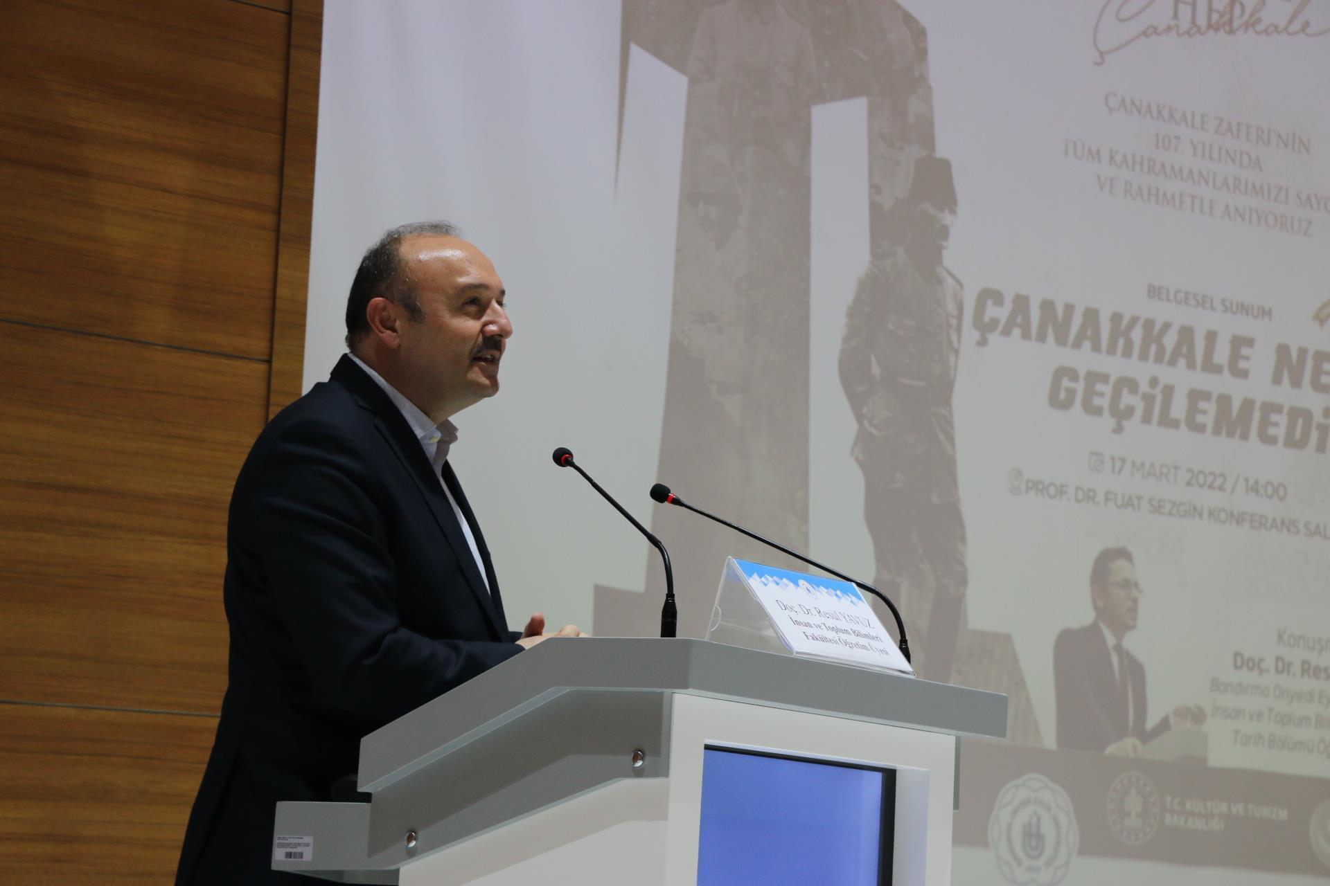 18 Mart Çanakkale Zaferi ve Şehitleri Anma Günü kapsamında Tarih Araştırmaları Topluluğumuz “Çanakkale Neden Geçilemedi?” konferansı düzenlendi. Prof. Dr. Fuat Sezgin Konferans Salonu'nda düzenlenen program aziz şehitlerimiz için bir dakikalık saygı duruşunun ardından İstiklal Marşı’nın okunması ile başladı. Programa dinleyici olarak Rektörümüz Prof. Dr. Süleyman Özdemir, İnsan ve Toplum Bilimleri Fakültesi Dekanımız Prof. Dr. Zekai Mete, Genel Sekreterimiz Cihangir Boz, akademik ve idari personel ve öğrencilerimiz katıldı. Konferansta Bölümümüz, Türkiye Cumhuriyeti Tarihi Anabilim Dalı Öğretim Üyesi Doç. Dr. Resul Yavuz belgesel sunumu eşliğinde Çanakkale Kara ve Deniz Savaşları’nı derinlemesine ele aldı.