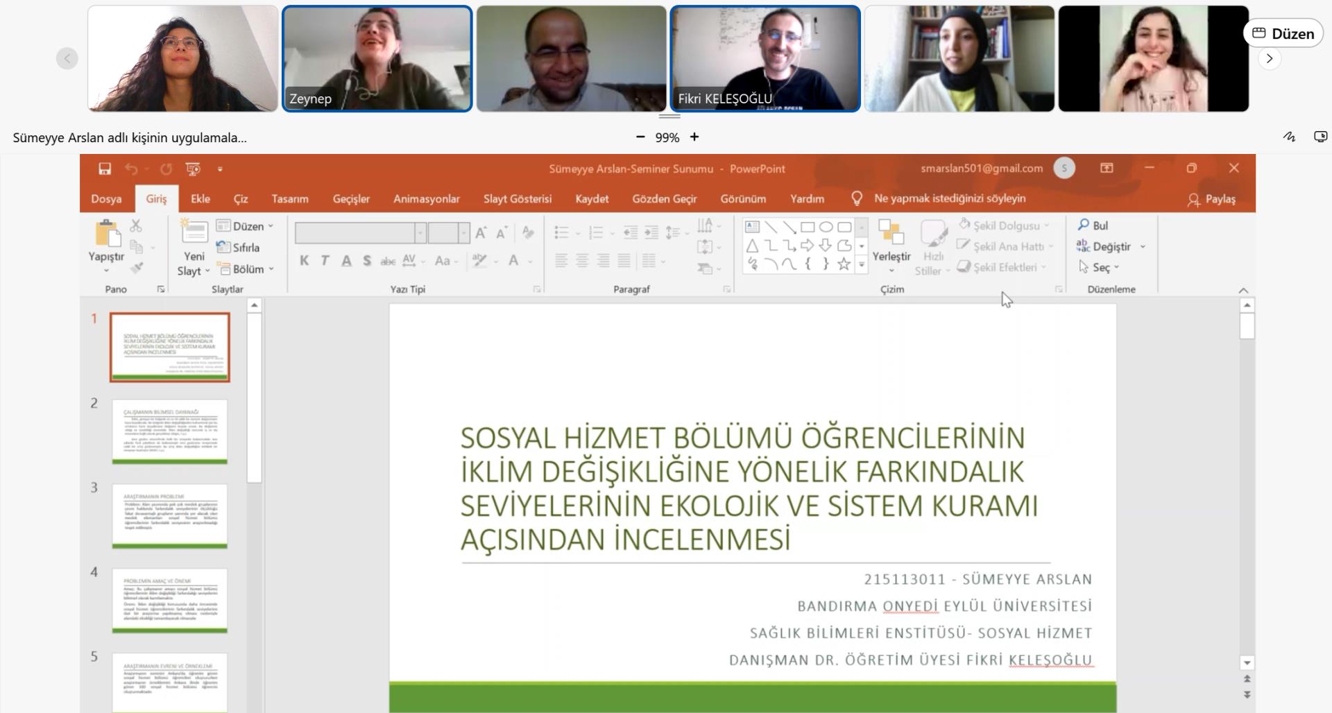 Yüksek lisans öğrencisi Sümeyye ARSLAN da “sosyal hizmet öğrencileri iklim değişikliğinin küresel boyutta bir sorun olduğunun farkındadırlar” varsayımından hareketle, Dr. Öğr. Üyesi Fikri KELEŞOĞLU danışmanlığında önermeyi planladığı “Sosyal Hizmet Bölümü Öğrencilerinin İklim Değişikliğine Yönelik Farkındalık Seviyelerinin Ekoloji ve Sistem Kuramı Açısından İncelenmesi” başlıklı nicel araştırma hakkında bilgi verdi.