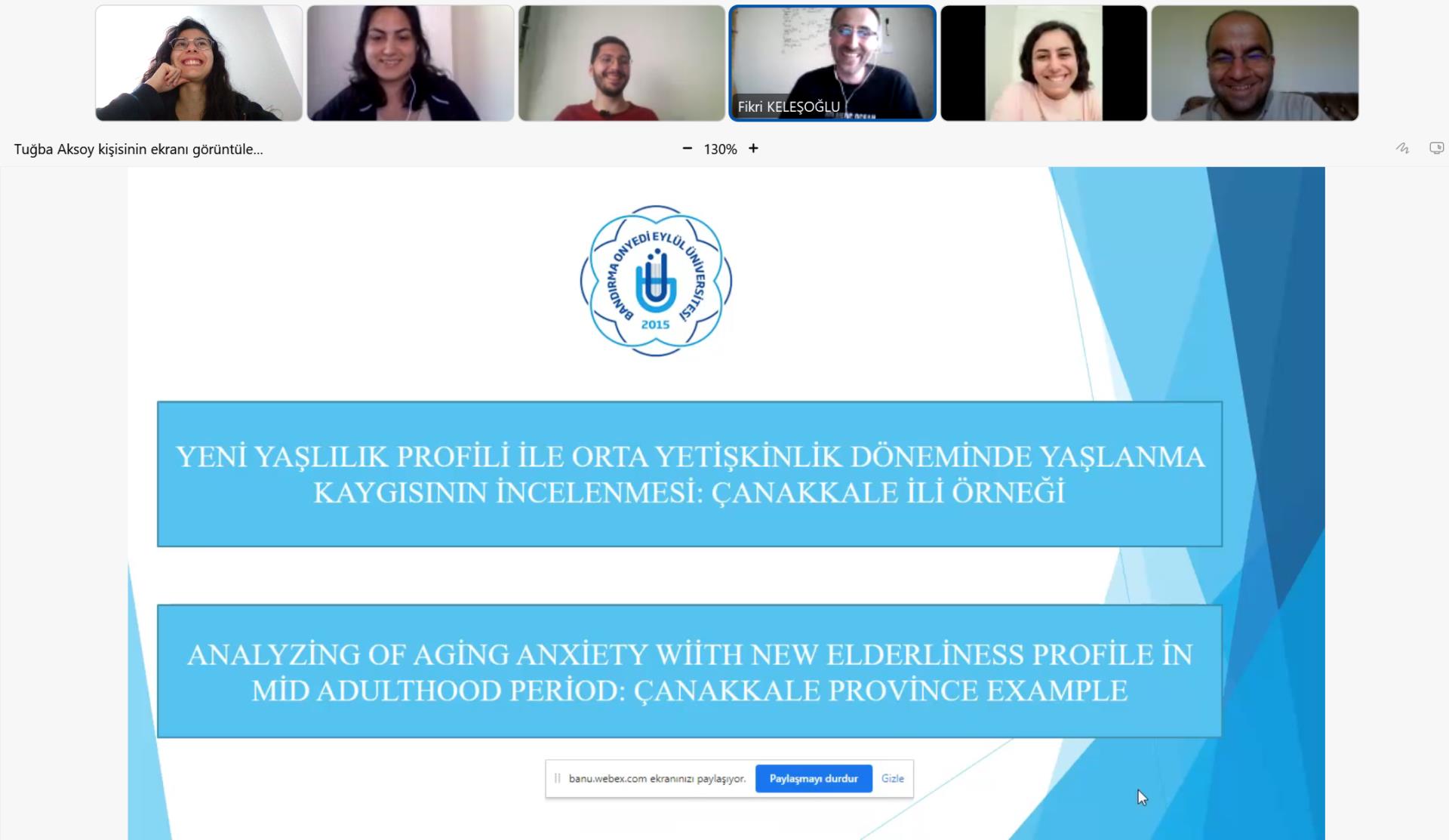 Yüksek lisans öğrencisi Tuğba AKSOY, Dr. Öğr. Üyesi Fikri KELEŞOĞLU danışmanlığında önermeyi planladığı “Yeni Yaşlılık Profili ile Orta Yetişkinlik Döneminde Yaşlanma Kaygısının İncelenmesi: Çanakkale İli Örneği” başlıklı nicel araştırma hakkında bilgi verdi. Araştırmasının amacını, geleceğin yaşlı nüfusunu oluşturacak olan orta yetişkinlik dönemindeki bireylerin, yaşlanma konusundaki kaygı düzeylerinin belirlenmesi ve yine bu kaygı oluşumunda etkili faktörlerin ilişkilendirilmesi olduğunu ifade etti.