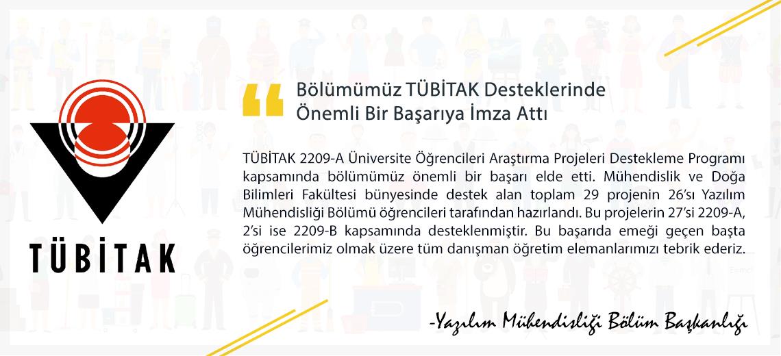 TÜBİTAK 2209-A Üniversite Öğrencileri Araştırma Projeleri Destekleme Programı kapsamında bölümümüz önemli bir başarı elde etti. Mühendislik ve Doğa Bilimleri Fakültesi bünyesinde destek alan toplam 29 projenin 26’sı Yazılım Mühendisliği Bölümü öğrencileri tarafından hazırlandı. Bu projelerin 27’si 2209-A, 2’si ise 2209-B kapsamında desteklenmiştir.
