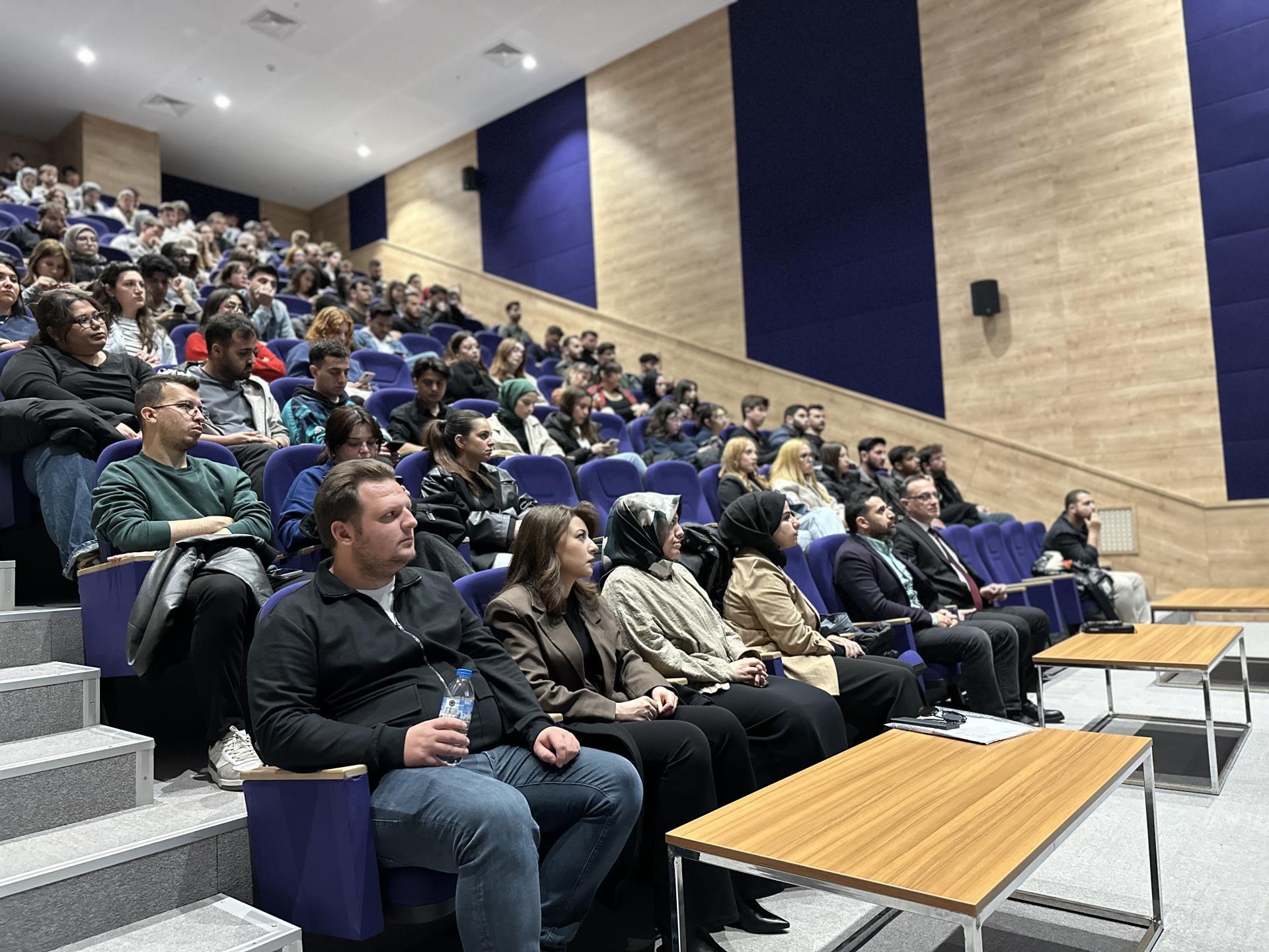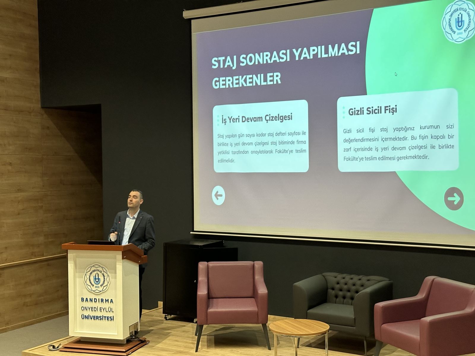 Seminere katılan bir diğer önemli kişi ise Fakülte idari personelinden Şef Volkan EROĞLU oldu. Staj işlemlerinin yapılmasından sorumlu idari personel olarak titizlikle yapılması gereken hususlarla ilgili bilgiler veren EROĞLU, öğrencilerimizin staj süreçlerinde kritik taşların yerine oturmasını sağladı.