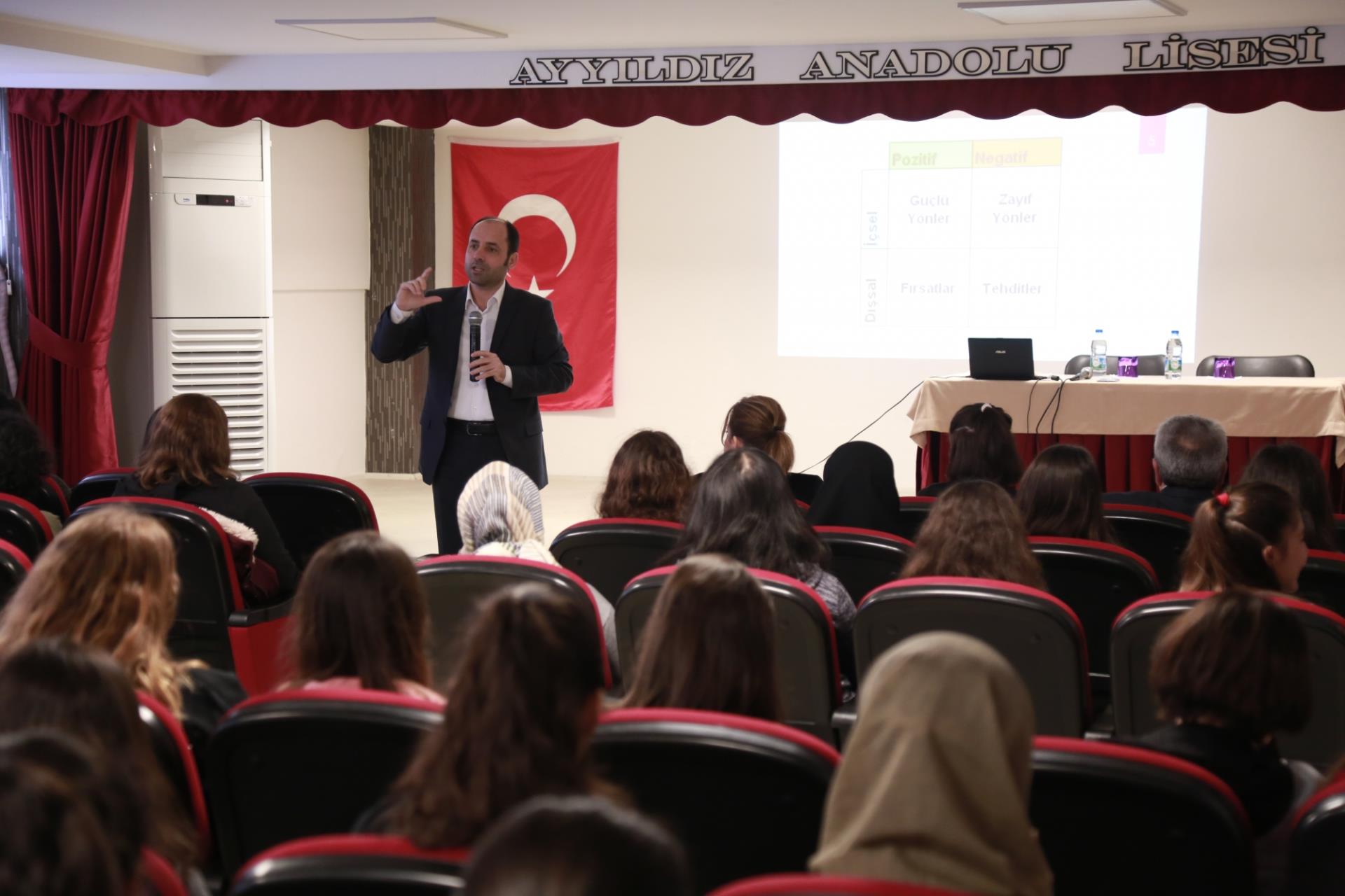 Ayyıldız Anadolu Lisesi ve Şehit Mehmet Güvenç Anadolu Lisesi’nde gerçekleştirilen tanıtım çalışmalarına İlçe Milli Eğitim Müdürümüz Mustafa Kılıçgil de iştirak ederek yapılan çalışmaları gözlemledi. Üniversitemiz ve Rehberlik ve Araştırma Merkezi Müdürlüğü işbirliği ile gerçekleştirilen çalışmalardan duyduğu memnuniyeti dile getiren Kılıçgil, üniversitemize teşekkür etti. Kurumsal İletişim Koordinatörümüz Ömer Şimşek de üniversitemizin tanıtım çalışmalarına vermiş oldukları destekten dolayı başta İlçe Milli Eğitim Müdürümüz Mustafa Kılıçgil olmak üzere, Rehberlik ve Araştırma Merkezi Müdürü Erol Gülle’ye ve müdürlük personeline teşekkürlerini sundu.